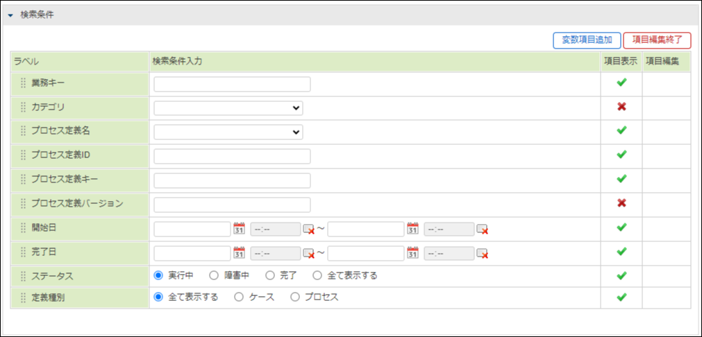 項目名 説明 項目編集ボタン 検索条件欄を編集モードに切り替わります。ヘッダ行、ラベル列の並び替えアイコン、項目表示列、項目編集列が表示されます。変数項目追加ボタン 変数項目追加ダイアログを表示します。検索項目にプロセスインスタンスの変数を追加します。※「IM-BPM 管理者」のみ利用可能です。項目編集終了ボタン 検索条件欄の編集モードを終了します。ヘッダ行、ラベル列の並び替えアイコン、項目表示列、項目編集列を非表示にします。項目表示列にて非表示とした検索項目も非表示にします。ラベル列 検索項目の項目名です。編集モード時、ドラック&ドロップにて表示順を並び替えが行えます。 検索条件入力列 検索条件を入力します。一部の項目(後述)は、「IM-BPM 管理者」の編集モードでしか入力できません。項目表示列 検索項目を表示・非表示を設定します。非表示とした場合、通常モードでは検索項目が表示されません。検索条件があり、項目を非表示とした場合でも入力した検索条件は有効です。項目編集列 変数項目の編集・削除を行うアイコンを表示します。※ 変数項目は「IM-BPM 管理者」のみ編集と削除ができます。検索項目
