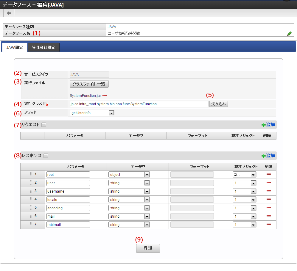 「データソース - 編集[JAVA]」画面の機能と各部の説明¶
