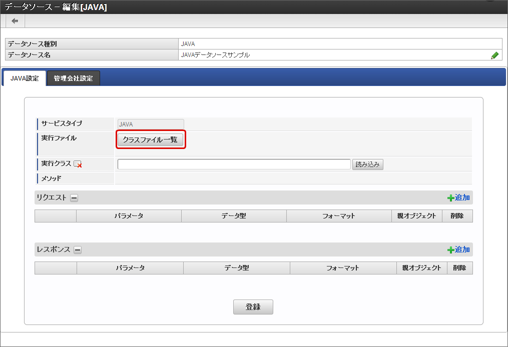 データソース種別として選択した「JAVA」が表示されます。実行ファイル