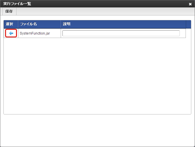 「実行ファイル一覧」画面から設定するファイルの「選択」をクリックします。