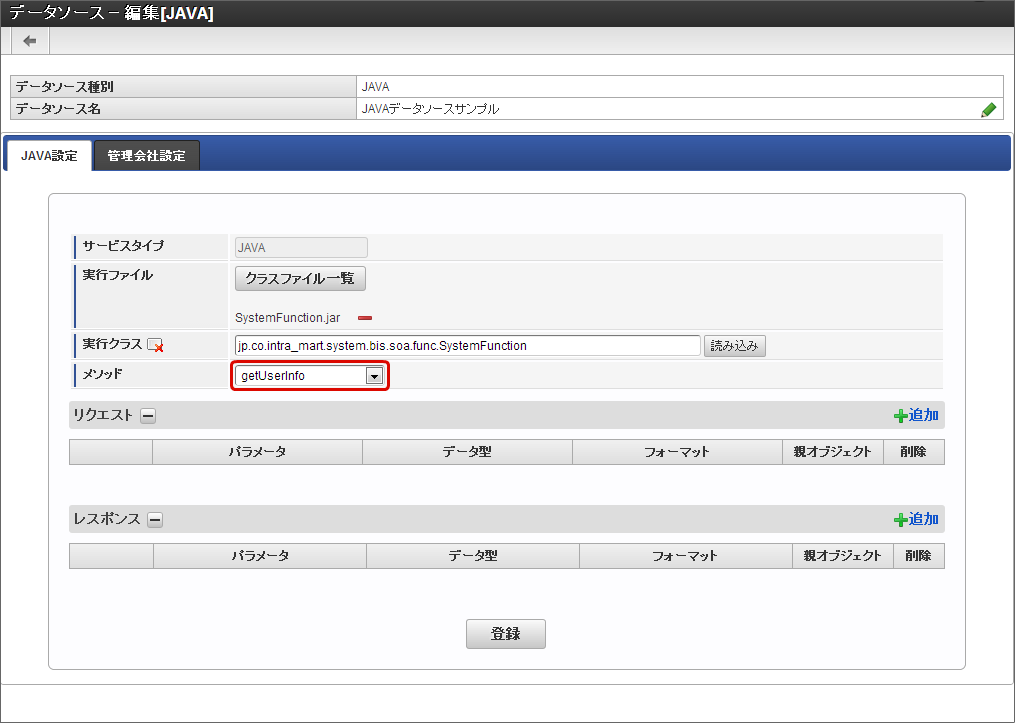 読み込んだクラスに含まれるメソッドを表示します。複数のメソッドがある場合は、利用するメソッドを選択します。リクエスト