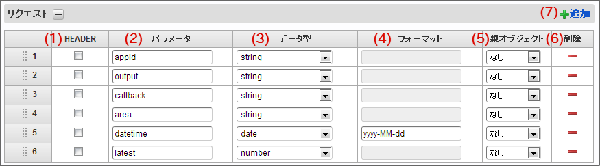 リクエストパラメータのデータ型を設定します。設定できるデータ型は、object / array / string / number / date / boolean です。コラム