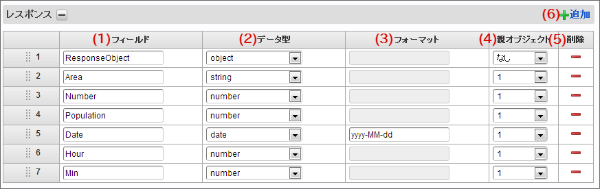 レスポンスフィールドのデータ型を設定します。設定できるデータ型は、object / array / string / number / date / boolean です。コラム