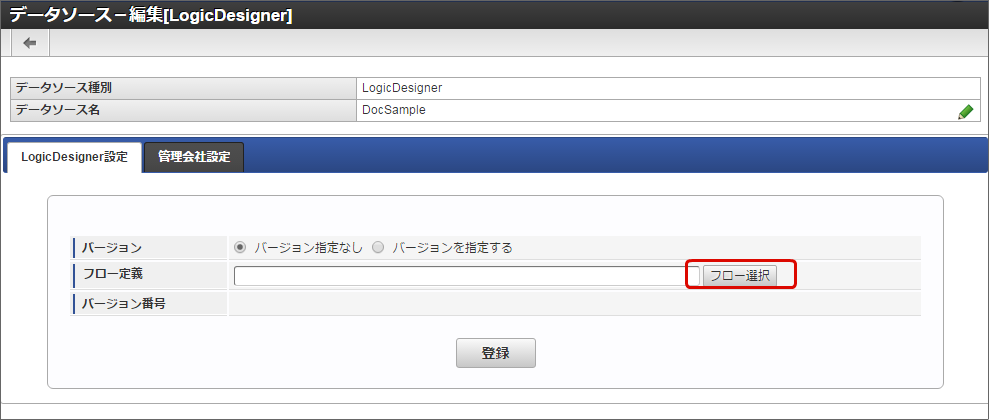 データソースを登録後に IM-LogicDesigner のフローの入出力設定を変更した場合は、再度フロー選択を行い、リクエストとレスポンスの情報を更新してください。「フロー選択」をクリックします。
