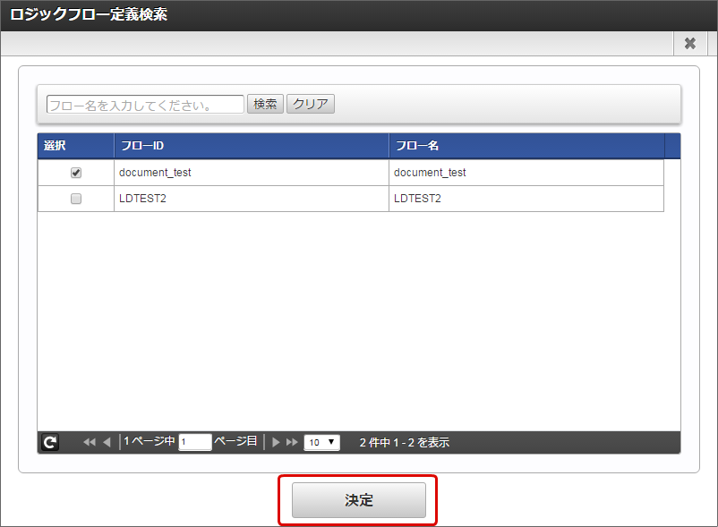 「フロー定義検索」画面から設定するフローを選択し、「決定」をクリックします。