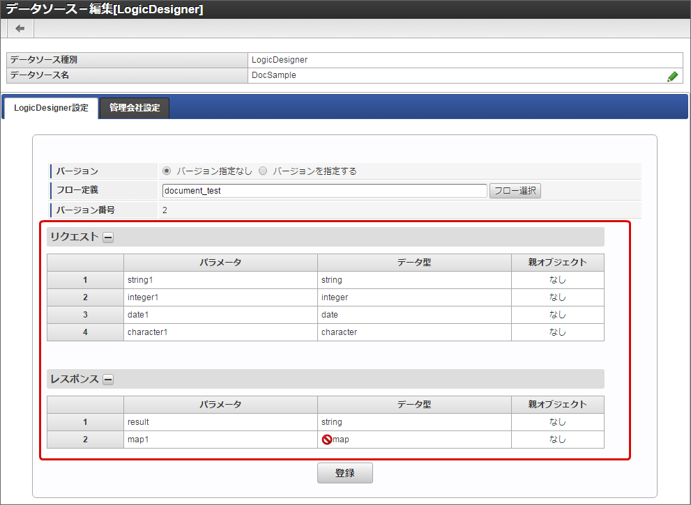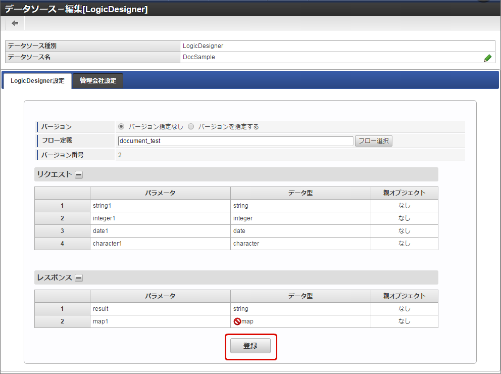 IM-LogicDesigner で入出力に設定したデータ型の中に、外部連携に対応していないデータ型が含まれる場合は、フロー選択時に警告メッセージが表示されます。その場合、データソース定義としては利用が可能ですが、外部連携では該当のデータ型へのマッピングはできません。入出力データ型の仕様については、「 IM-LogicDesigner との連携の仕様 」を参照してください「登録」をクリックします。