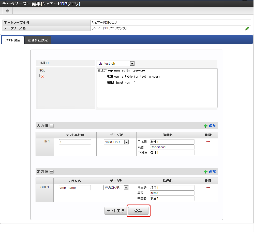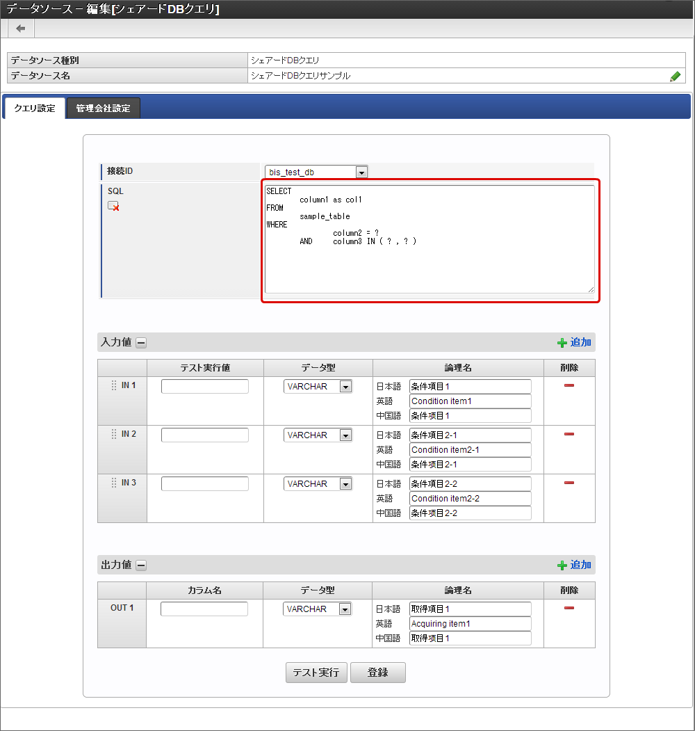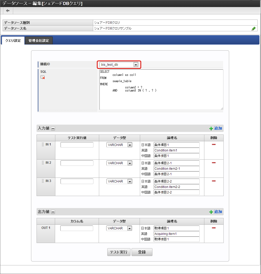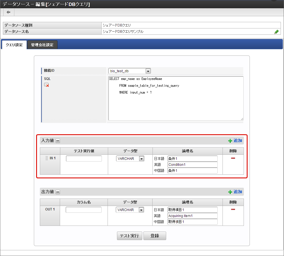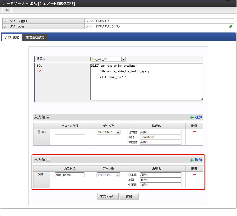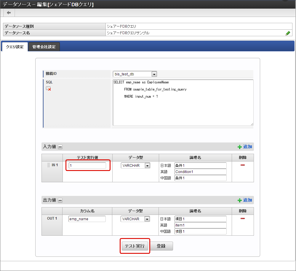 - テスト実行値:「SQL」に記述したデータ処理の条件(WHERE句)に記述したカラム(テーブルの項目)に代入する値を入力します。アプリケーションの画面アイテムから入力されることが想定される値を入力します。