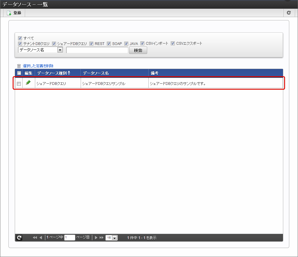「データソース - 編集[シェアードDBクエリ]」画面の内容は以下の通りです。