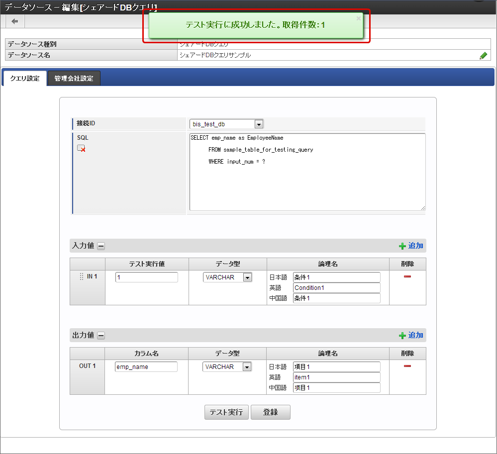 クエリ詳細設定の出力値の設定を更新した場合には、該当のデータソース定義を呼び出している外部連携設定のデータマッパーの設定を再度実施するようにしてください。データマッパーの設定を行わないと、データソース定義で行った更新内容が反映されません。テスト実行
