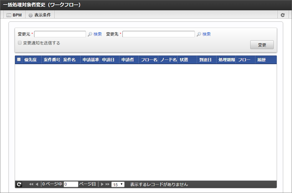 BISシステム管理者の場合は、「サイトマップ」→「IM-BIS」→「システム管理者」→「フロー運用管理」→「一括処理対象者変更(ワークフロー) [*1] 」をクリックします。BIS業務管理者の場合は、「サイトマップ」→「IM-BIS」→「業務管理者」→「フロー」→「一括処理対象者変更(ワークフロー) [*1] 」をクリックします。*1 - 変更したい案件が BISフロー の場合は「一括処理対象者変更(BISフロー)」をクリックします。 「一括処理対象者変更」画面が表示されます。初期表示の場合は、一覧には何も表示されません。「変更元」を選択して、処理対象者の変更を行いたい案件を検索します。 変更したい案件を検索します。「変更元」の右にある「検索」リンクをクリックします。「変更元」を選択するフローティングウィンドウが表示されます。「変更元」は以下を選択できます。