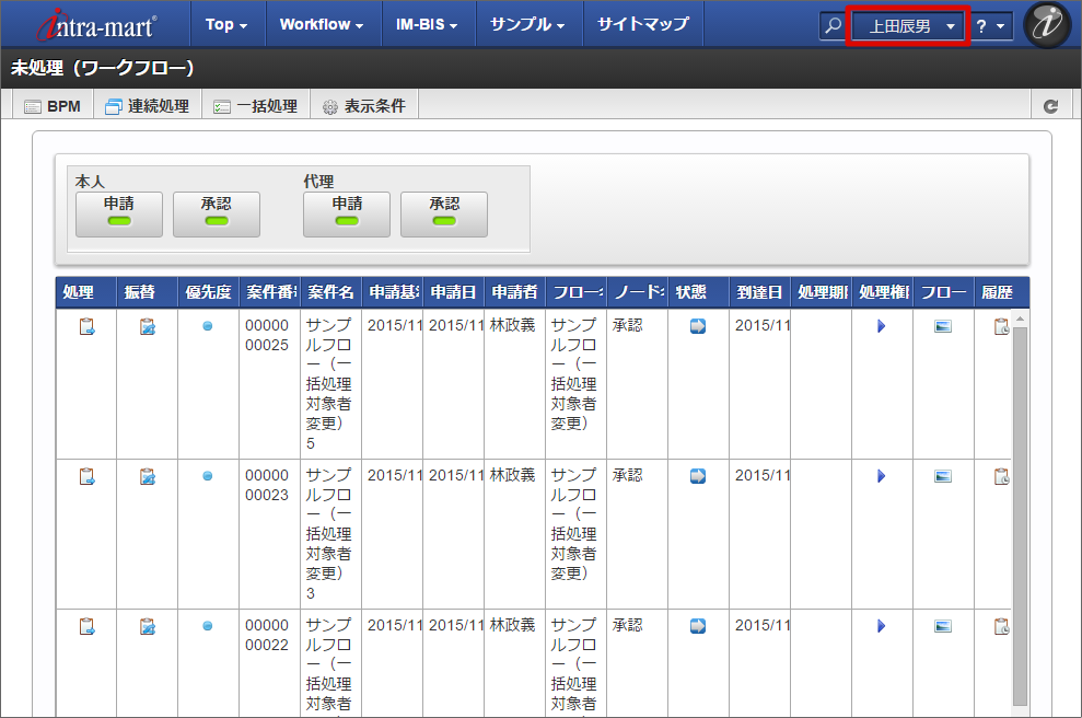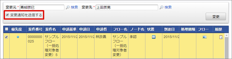 システム日時点で有効なユーザがタスク(ノード)の処理対象者として展開されます。 選択した案件の処理対象者が「変更元」から「変更先」に変更されました。以下は、「上田辰男」の未処理一覧画面です。変更した案件が表示されました。