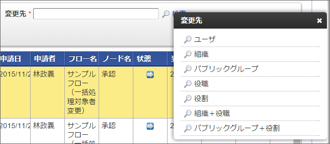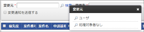 変更先の処理対象者を選択します。「変更先」の右にある「検索」リンクをクリックします。「変更先」を選択するフローティングウィンドウが表示されます。「変更先」は以下を選択できます。