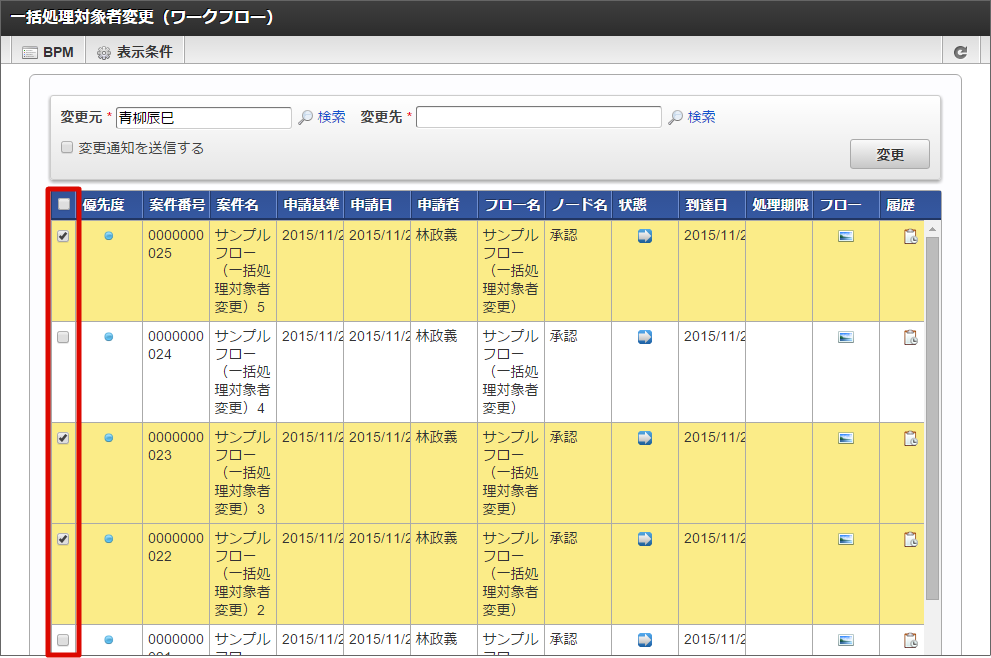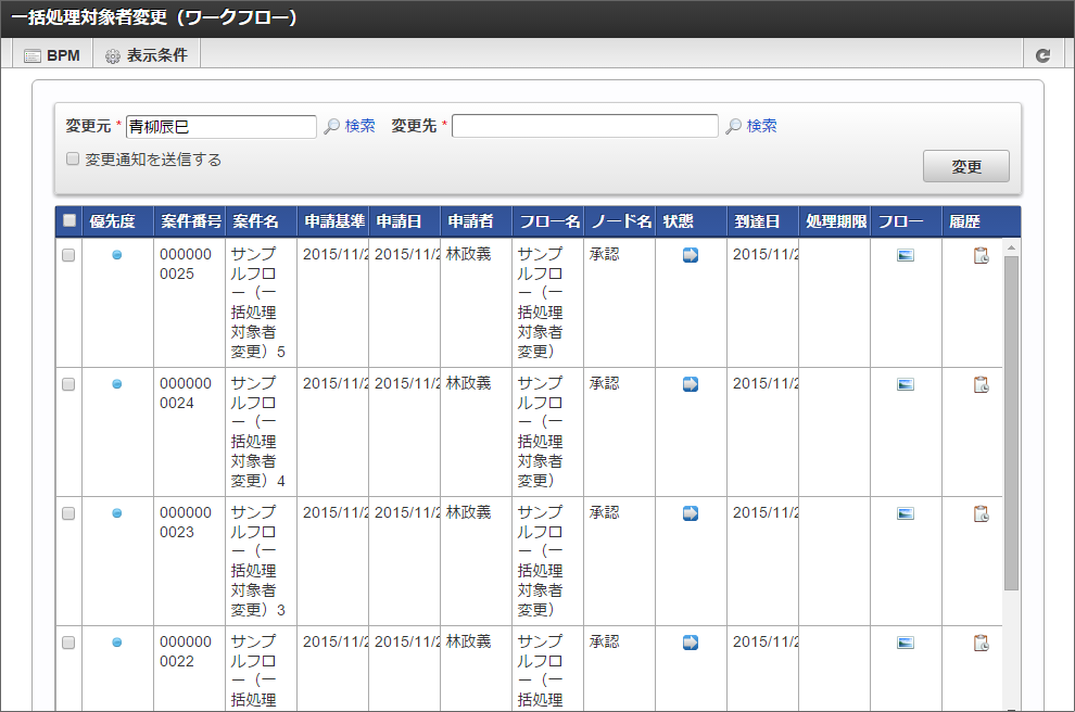 一括処理対象者メニューでは、未完了案件の処理対象者を一括で変更できます。