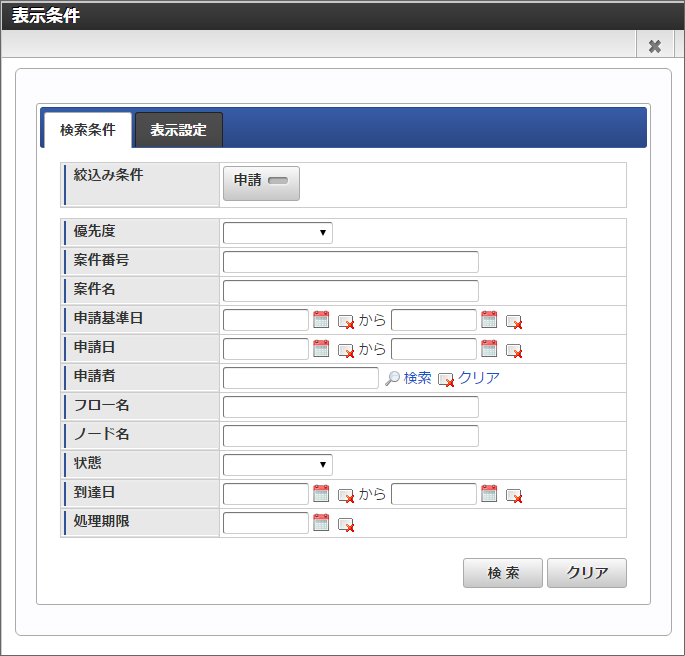 <表示条件>を押下します。「<表示条件>」画面(タブ:検索条件)が表示されます。絞込条件 - 申請