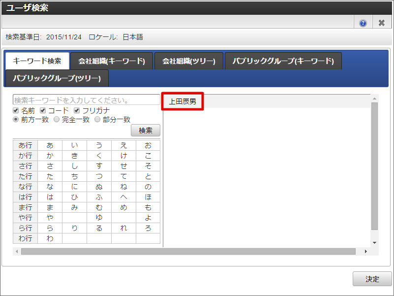 例として、「変更先」をユーザにして「上田辰男」に変更します。フローティングウィンドウの「ユーザ」を選択→「ユーザ検索」で「上田辰男」を選択します。変更先に変更の通知を行いたい場合は、「変更通知を送信する」のチェックをオンにしてください。