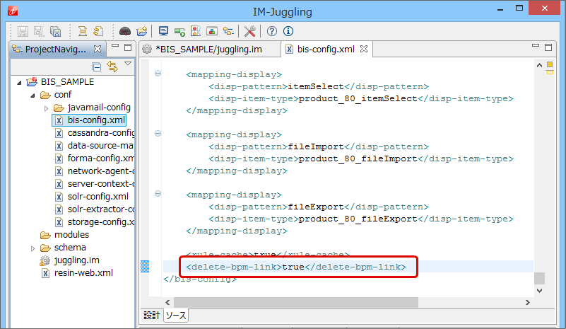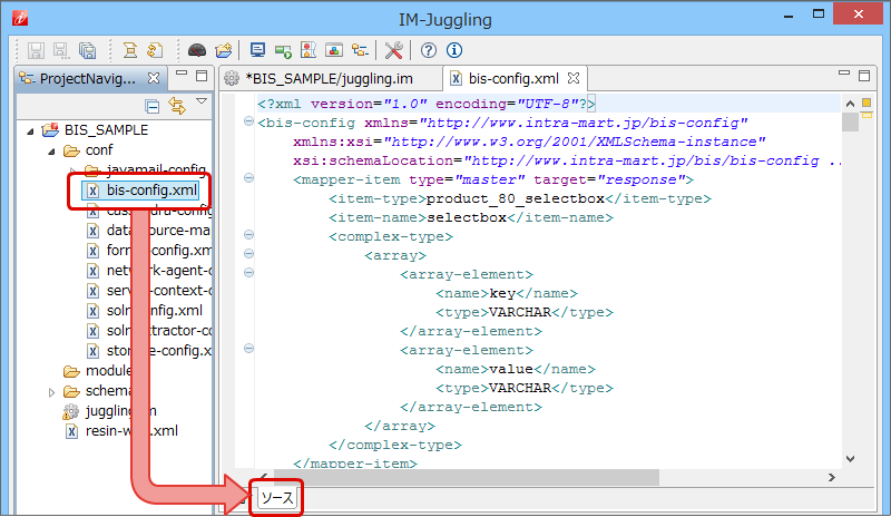 「ProjectNavigator」内の <(プロジェクト名)/conf/bis-config.xml> ファイルをダブルクリックで開き、「ソース」タブを選択してください。