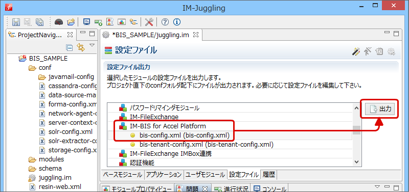 「BISフロー」に関する機能を有効/無効の切り替えは、「bis-config.xml」で設定します。bis-configの設定を変更するには、以下の手順で IM-Juggling から設定ファイルを編集後、WARファイルの再デプロイを実施してください。