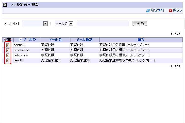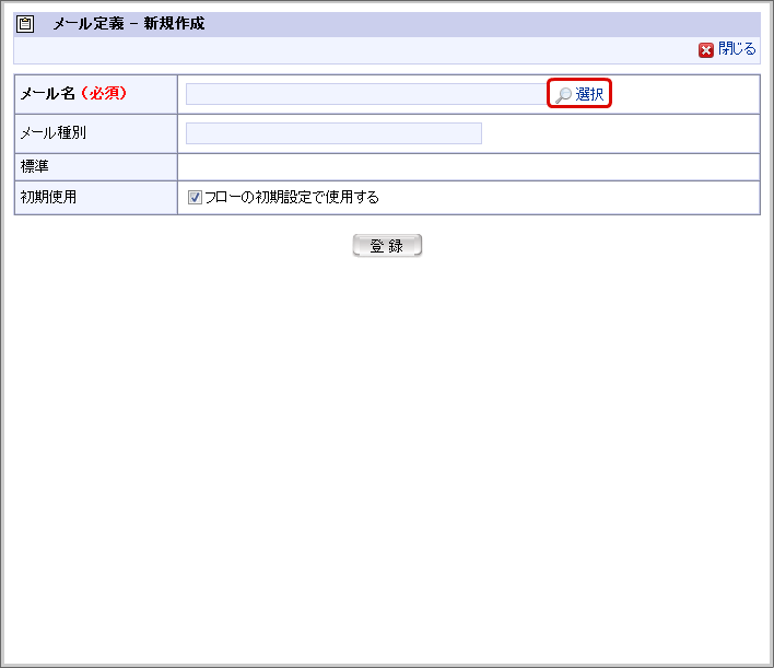 「メール定義 - 新規作成」画面で「選択」をクリックします。