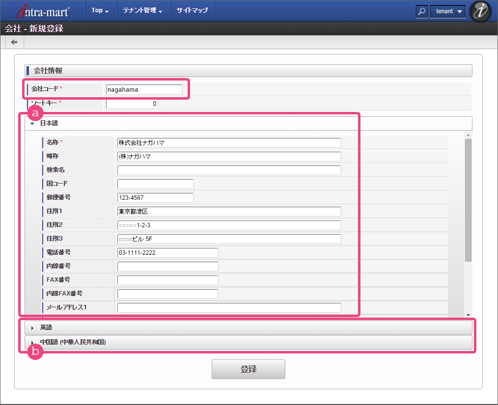 会社の名称や住所などの基本情報を入力しましょう。複数のロケール(言語)が利用できる環境の場合には、すべてのロケール分の情報を入力します。 最後に「登録」をクリックし、会社の情報を登録しましょう。