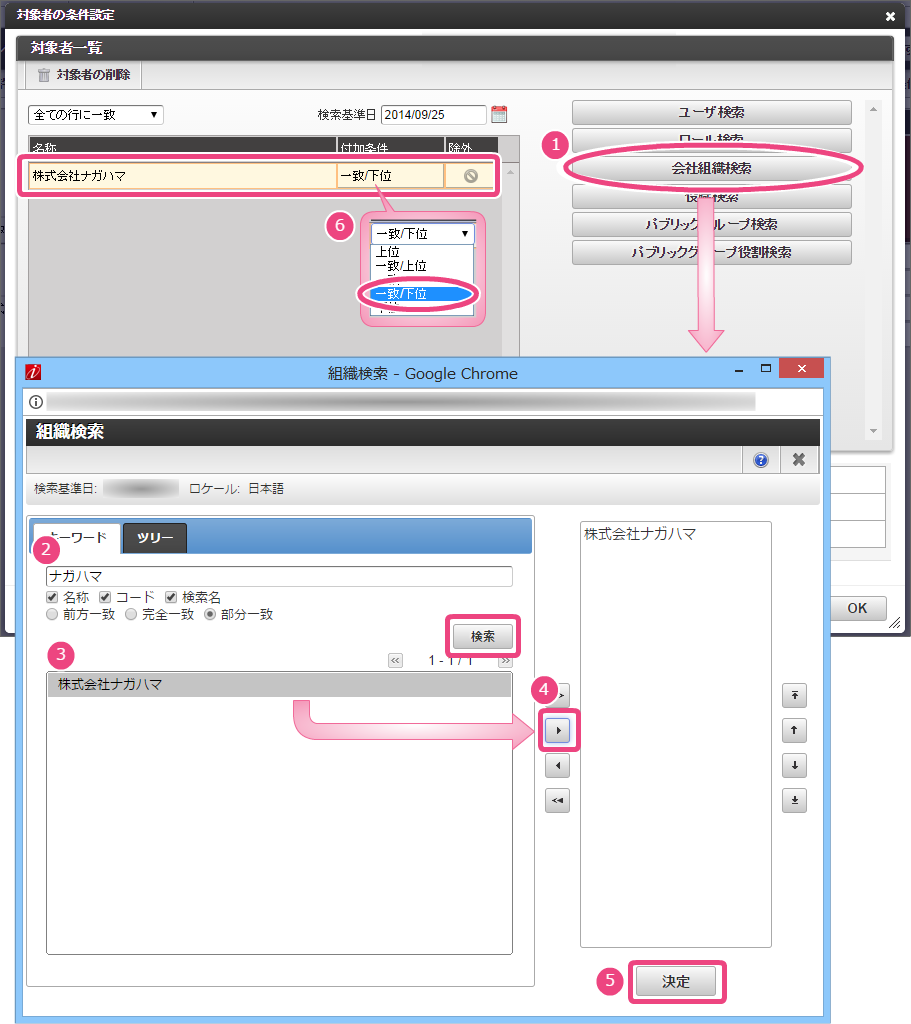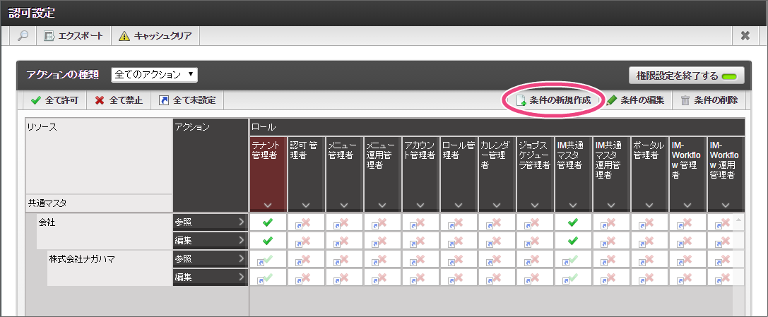 作成した会社に所属するユーザ(社員)は、設定を行わないと、ワークフローの承認者の設定などでユーザの検索を行ってもユーザの情報が参照できず、ユーザを検索することができません。会社の社員であれば、その会社に所属するすべてのユーザ(社員)を検索できるように参照権限を設定しましょう。 会社一覧から「認可設定」をクリックしましょう。 「権限設定を開始する」をクリックしましょう。 権限を付与するためには、対象のユーザが所属する会社を横軸(条件)に追加する必要がありますので、「条件の新規作成」をクリックしましょう。 以下の手順で「認可設定画面」の条件(対象者)に「株式会社ナガハマ」を追加しましょう。 横軸のリソースで作成した会社(株式会社ナガハマ)の「参照」と、先の手順で追加した横軸(条件)の会社(株式会社ナガハマ)が交差する部分をクリックして、になるようにしましょう。