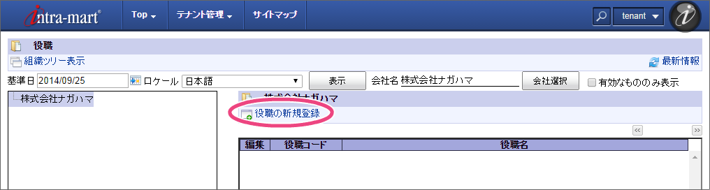 組織の情報を表示している画面で「役職表示」をクリックしましょう。 「役職の新規登録」をクリックして、役職の情報の登録をはじめましょう。