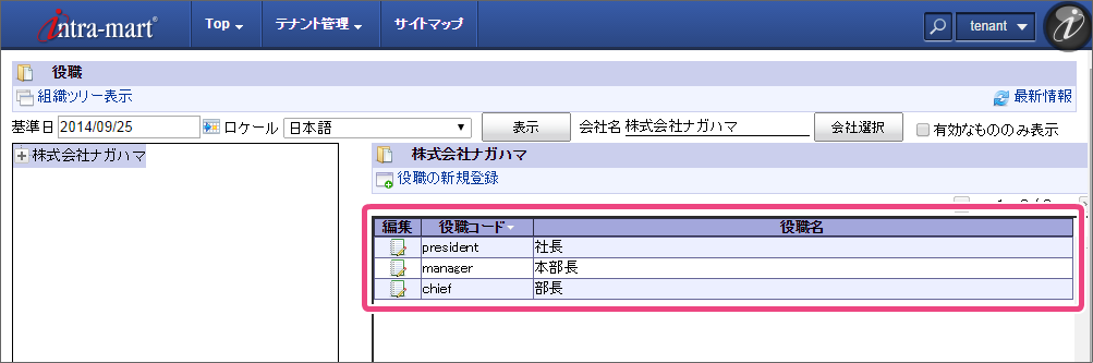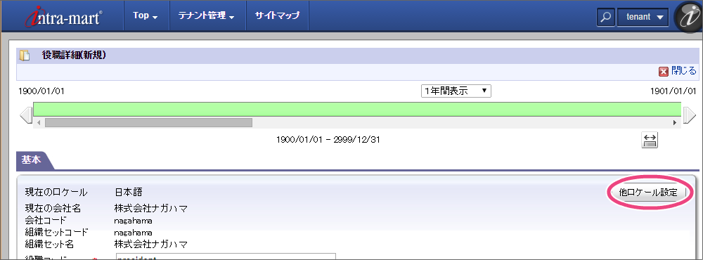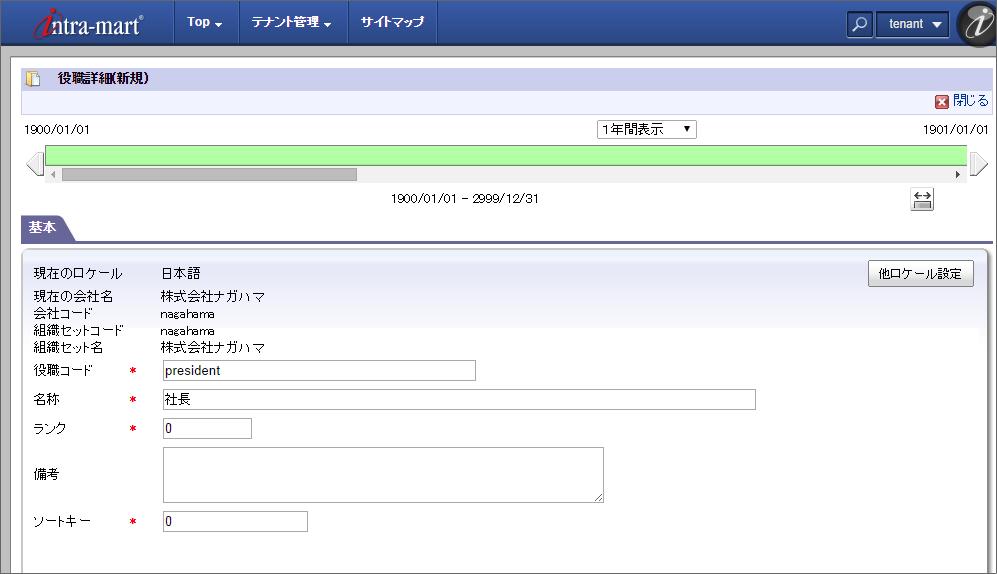 役職の名称などの基本情報を入力しましょう。 複数のロケール(言語)が利用できる環境の場合には、すべてのロケール分の情報を入力します。 他ロケール情報を登録する場合には、まず「他ロケール設定」をクリックしましょう。 設定する言語の右のチェックボックスをクリックした後、「日本語からコピー」をクリックしてください。 日本語からのコピーを行わない場合には、チェックボックスをクリックした後に、必要な情報を入力していきましょう。 日本語で設定した内容を、他の言語(図では英語)にコピーすることができました。 中国語など他の言語も利用できる場合には、同様にチェックボックスをオンにした上でコピーや、必要な情報を入力しましょう。 最後に「決定」をクリックすると、言語別の情報の登録は完了です。 最後に「登録」をクリックし、役職の情報を登録しましょう。 同じ手順を繰り返し、以下の図のように必要な役職をすべて登録しましょう。