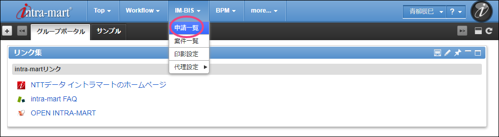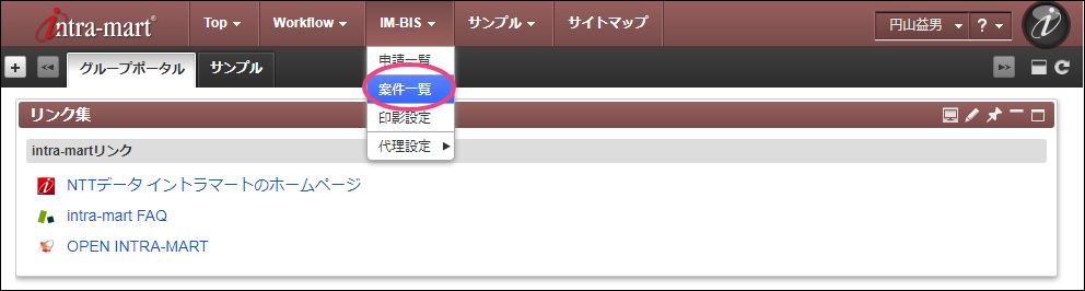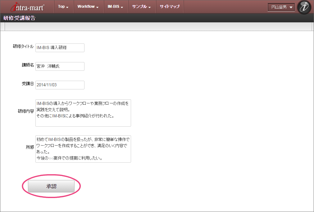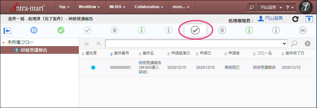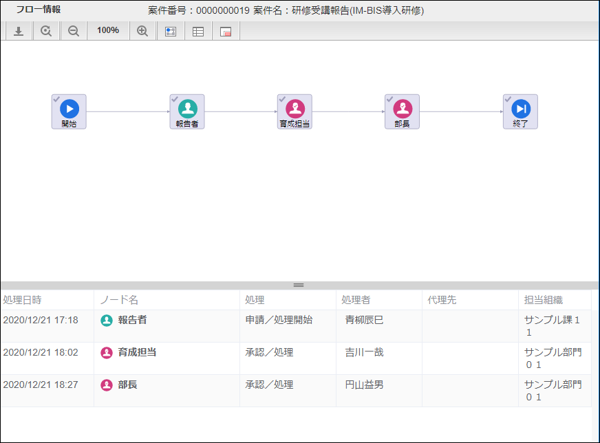 最後の部長に設定した「円山益男」(ユーザコード:maruyama)でログインしましょう。 上部のメニューの「IM-BIS 」にマウスを重ねてから「案件一覧」をクリックしましょう。 青柳さんが申請した案件にマウスを重ね、表示されたメニューの「処理」をクリックしてください。 内容を確認し、「承認」をクリックしましょう。 「承認/処理」をクリックすると、円山さんの承認が完了します。円山さんはこのフローの最後の処理となるため、これで案件が完了しました。 完了時点のフローを確認すると、以下のように表示されます。
