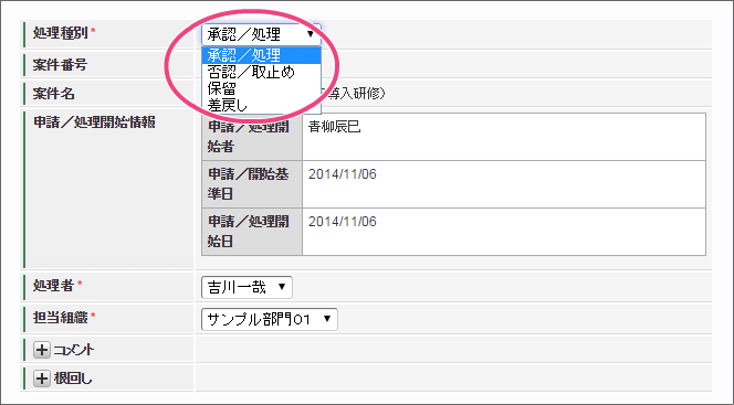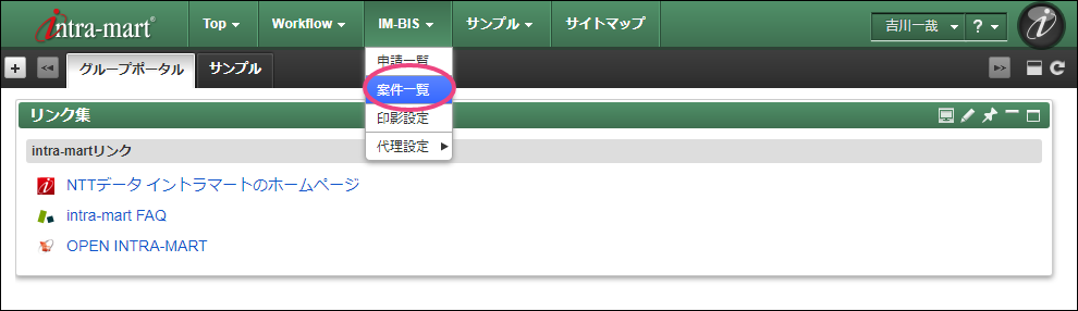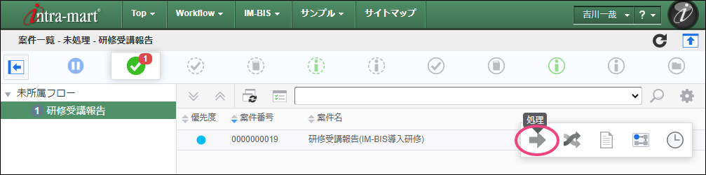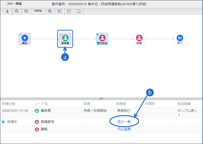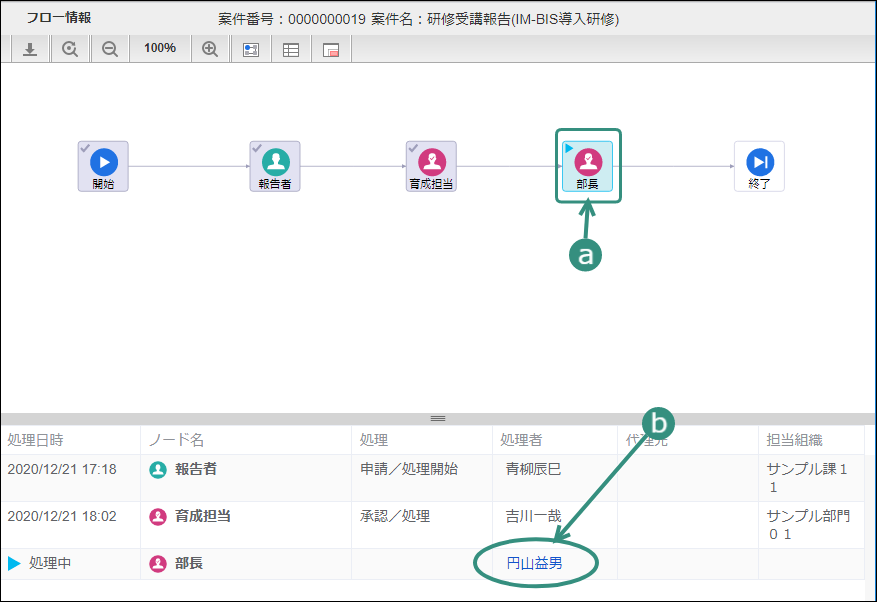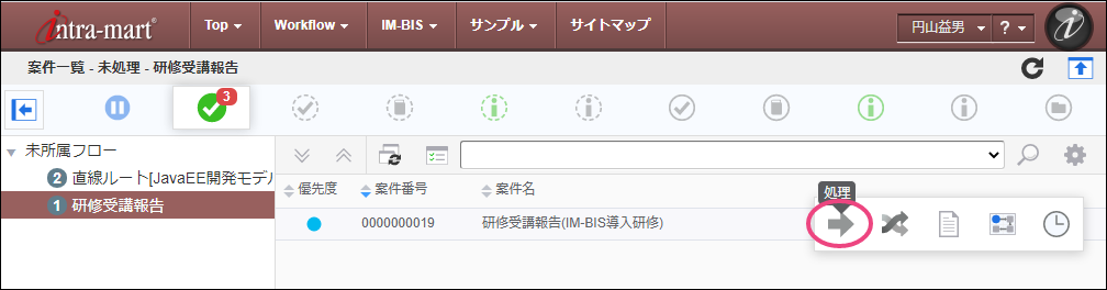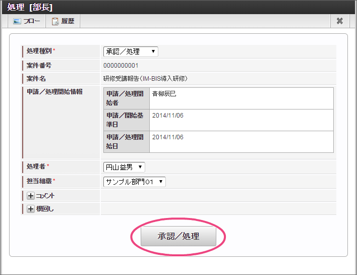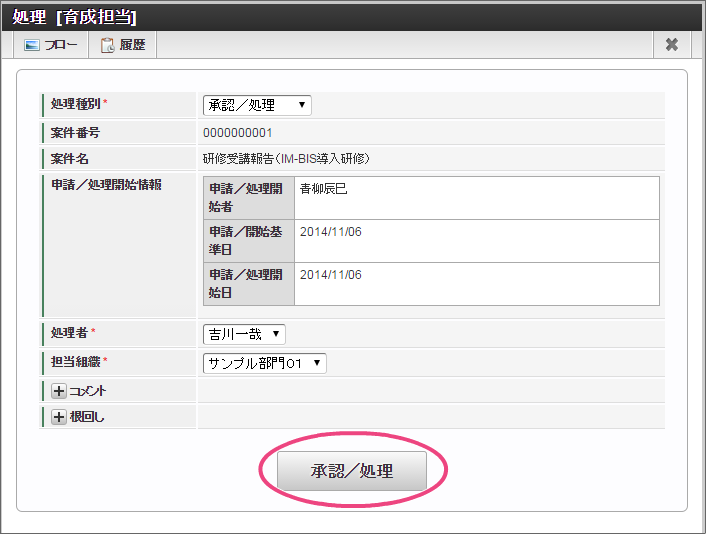 次の育成担当者に設定した「吉川一哉」(ユーザコード:yoshikawa)でログインしましょう。 上部のメニューの「 IM-BIS 」にマウスを重ねてから「案件一覧」をクリックしましょう。 青柳さんが申請した案件にマウスを重ね、表示されたメニューの「処理」をクリックしてください。 内容を確認し、「承認」をクリックしましょう。 吉川さんの承認を完了するために「承認/処理」をクリックしてください。 この時点のフローを確認すると、以下のように表示されます。次は、部長の円山さんに切り替えて操作しましょう。