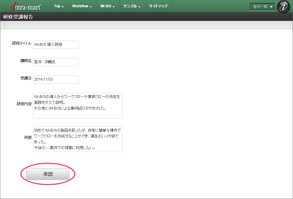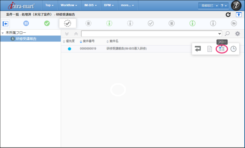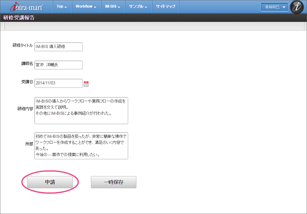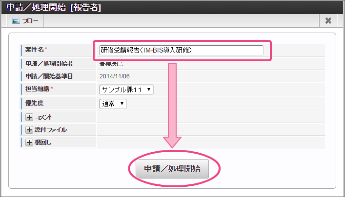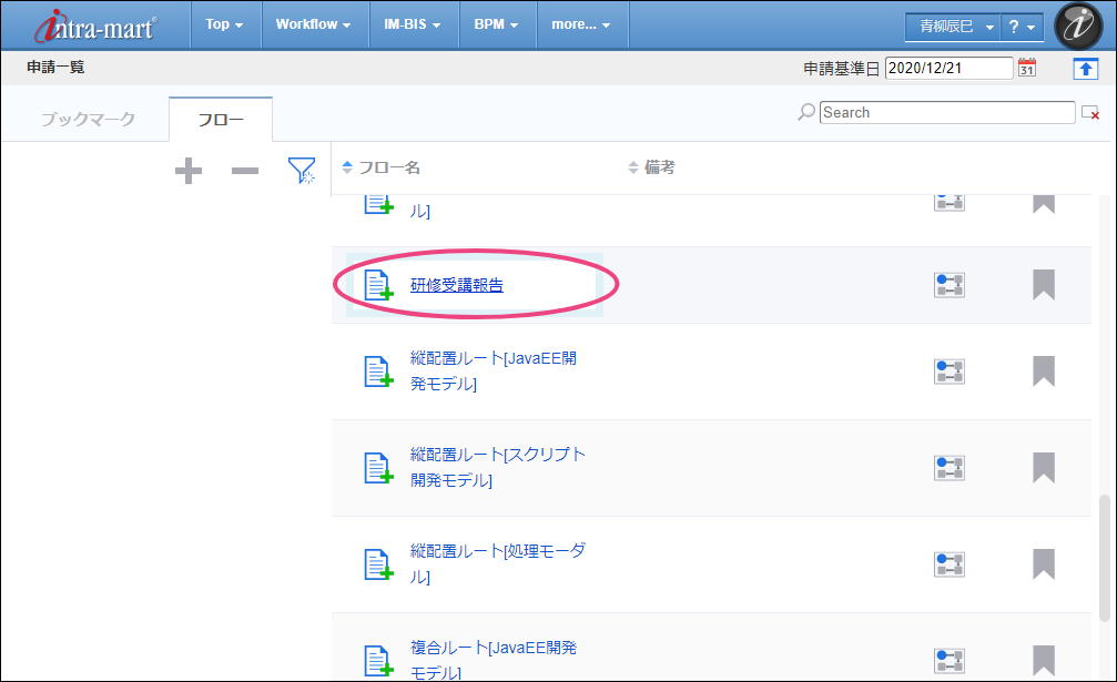 報告者に設定した「青柳辰巳」(ユーザコード:aoyagi)でログインしましょう。 上部のメニューの「 IM-BIS 」にマウスを重ねてから「申請一覧」をクリックしましょう。 「フロー」タブを選択し、「研修受講報告」をクリックしてください。 画面の各項目の内容を入力してください。入力が終わったら、「申請」をクリックしましょう。 案件名を入力したら、申請を完了するために「申請/処理開始」をクリックしてください。 この時点のフローを確認すると、以下のように表示されます。次は、育成担当の吉川さんに切り替えて操作しましょう。