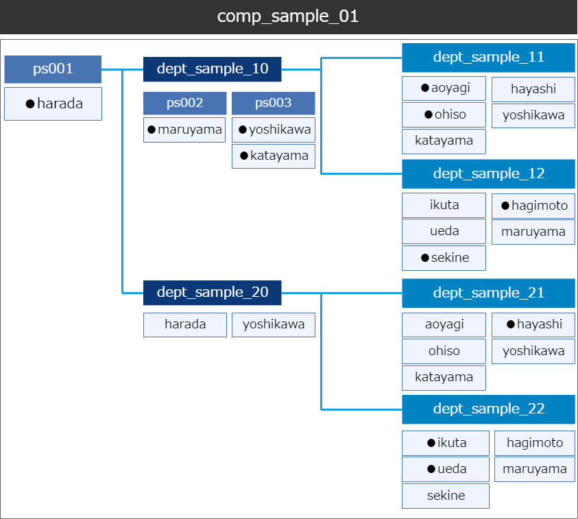 本章で扱う会社・組織・登場人物(社員)は、以下の図の通りです。以下の組織・ユーザは、「サンプルデータセットアップ」で登録されるデータと同じ内容です。本章で説明する手順は、以下の図に合わせて記述しております。図中の組織コード、ユーザIDに対応する名称は以下の表の通りです。図中の”●”は主所属を表します。組織コード 組織名 役職コード 役職名 ユーザID ユーザ名 comp_sample_01 サンプル会社 ps001 社長 harada 原田浩二 dept_sample_10 サンプル部門01 ps002 部長 maruyama 円山益男 ps003 課長 yoshikawa 吉川一哉 - - katayama 片山聡 dept_sample_20 サンプル部門02 - - harada 原田浩二 - - yoshikawa 吉川一哉 dept_sample_11 サンプル課11 - - aoyagi 青柳辰巳 - - ohiso 大磯博文 - - katayama 片山聡 - - hayashi 林政義 - - yoshikawa 吉川一哉 dept_sample_12 サンプル課12 - - ikuta 生田一哉 - - ueda 上田辰男 - - sekine 関根千香 - - hagimoto 萩本順子 - - maruyama 円山益男 dept_sample_21 サンプル課21 - - aoyagi 青柳辰巳 - - ohiso 大磯博文 - - katayama 片山聡 - - hayashi 林政義 - - yoshikawa 吉川一哉 dept_sample_22 サンプル課22 - - ikuta 生田一哉 - - ueda 上田辰男 - - sekine 関根千香 - - hagimoto 萩本順子 - - maruyama 円山益男 コラム