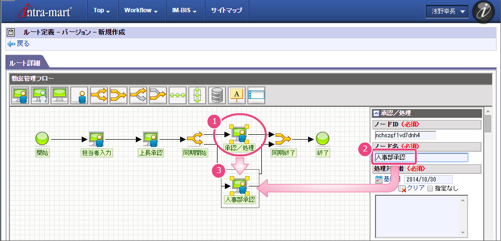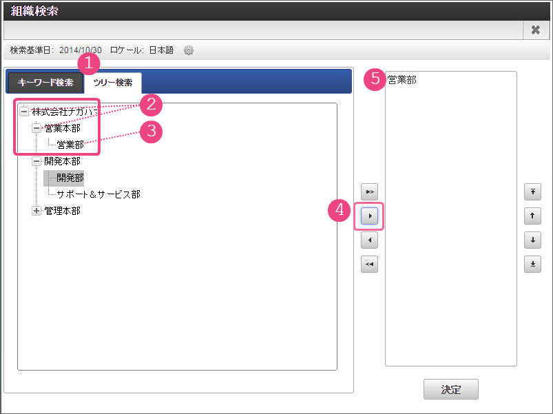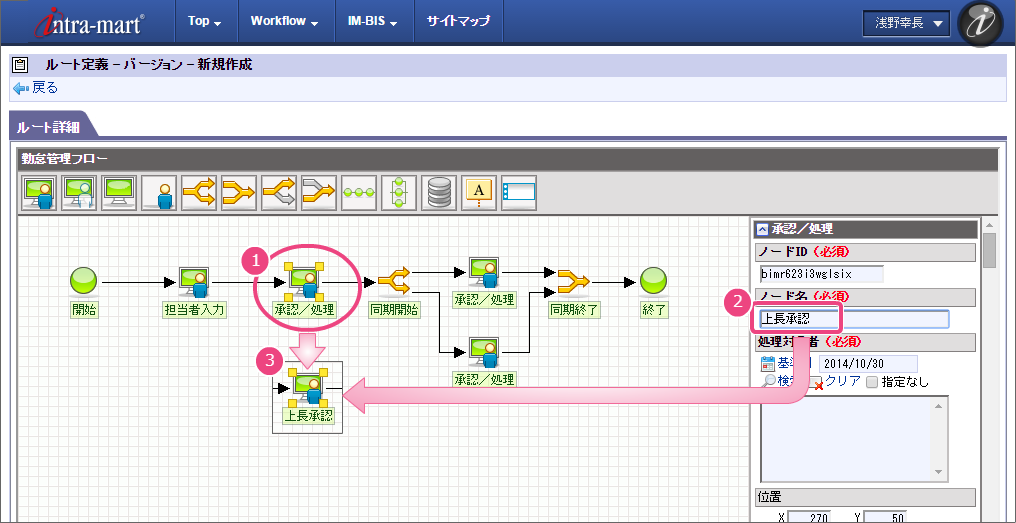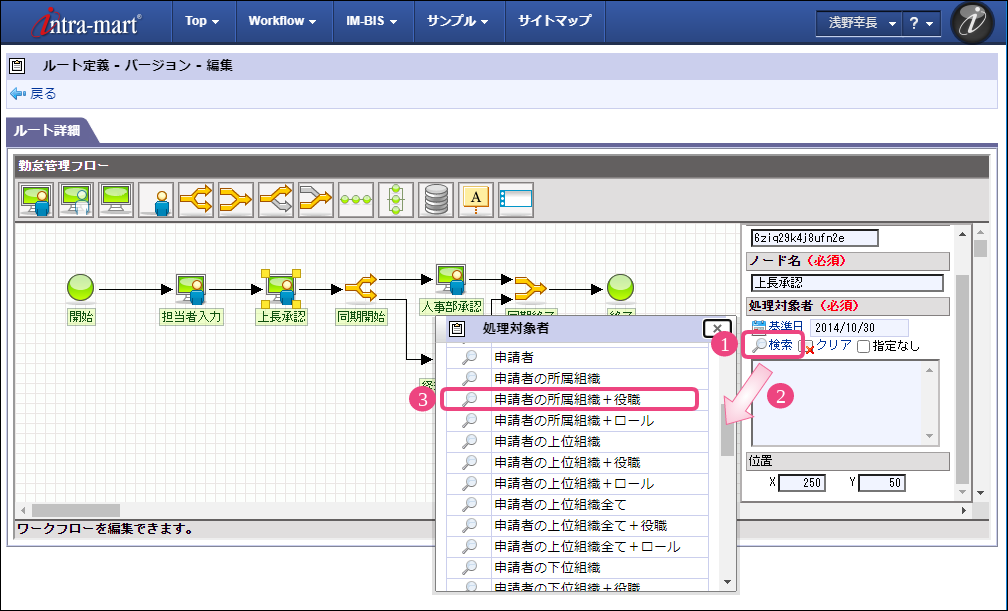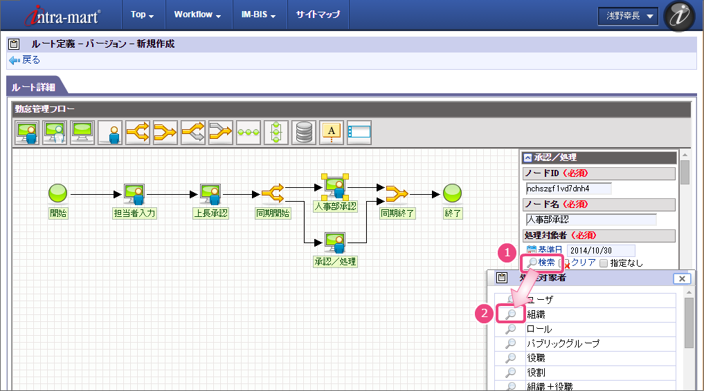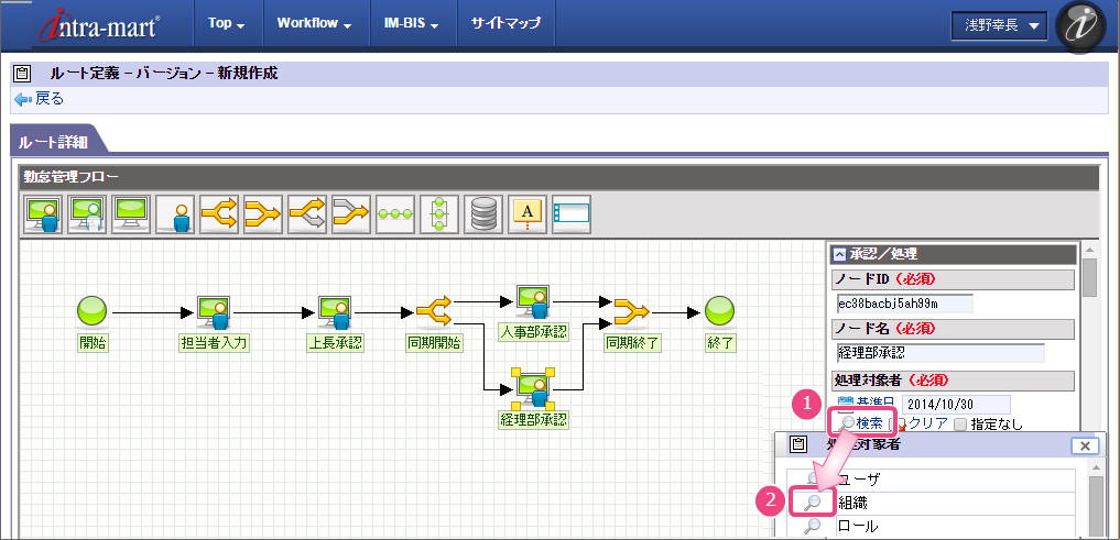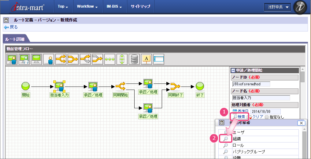 以下の手順でノード名を設定してください。 以下の手順で「担当者入力」の処理が実行できるユーザの検索画面を表示してください。 組織検索では、以下の手順で営業部を選択してください。 引き続き、以下の手順で開発部を選択してください。 これで、営業部、開発部に所属するユーザが勤怠実績を申請できるようになりました。 以下の手順で2番目のノード名を設定してください。 以下の手順で「上長承認」の処理が実行できるユーザの検索画面を表示してください。 申請者の所属組織+役職の検索では、以下の手順で対象の組織と役職の組み合わせを設定してください。