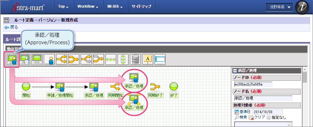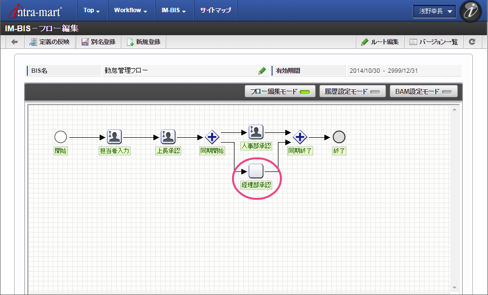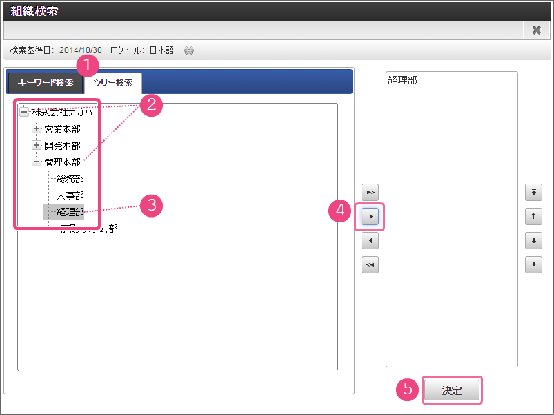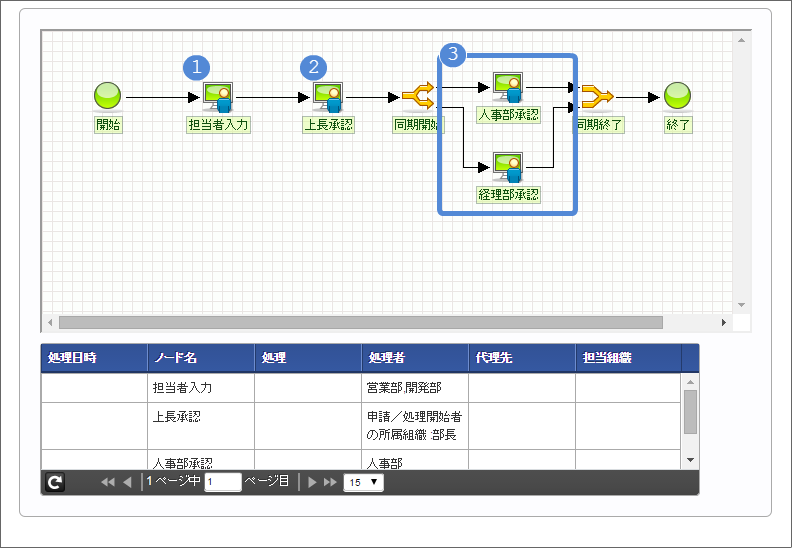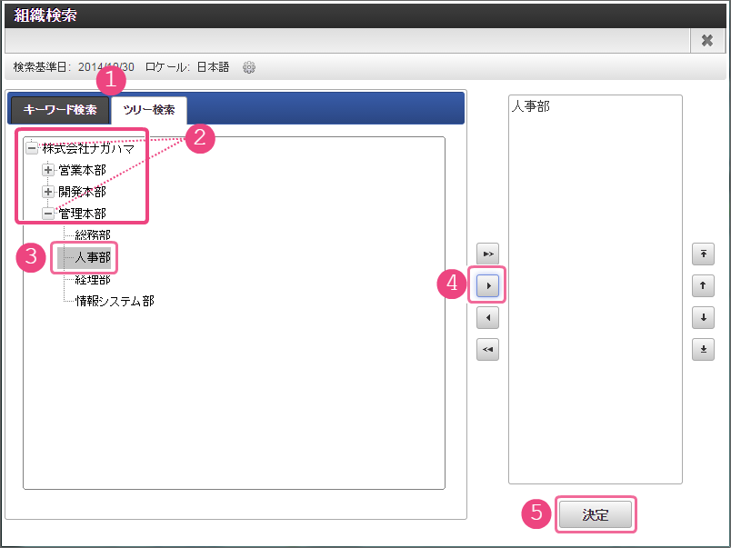 開発部の部長・竹中さんだけが承認できる 以下の手順で人事部承認のノード名を設定してください。 以下の手順で「人事部承認」の処理が実行できるユーザの検索画面を表示してください。 組織検索では、以下の手順で対象の組織を選択してください。 同様に、以下の手順で経理部承認のノード名を設定してください。 以下の手順で「経理部承認」の処理が実行できるユーザの検索画面を表示してください。 組織検索では、以下の手順で対象の組織を選択してください。 これで、経路情報の設定が完了しましたので、「登録」をクリックして保存してください。