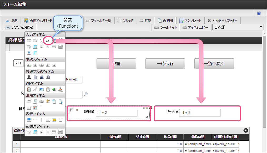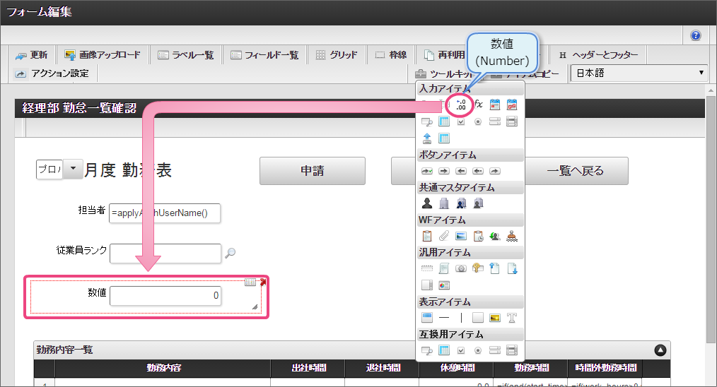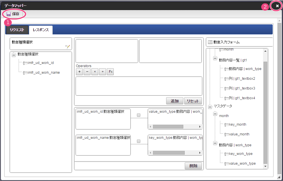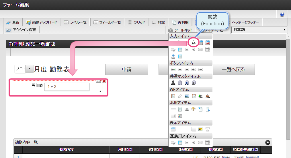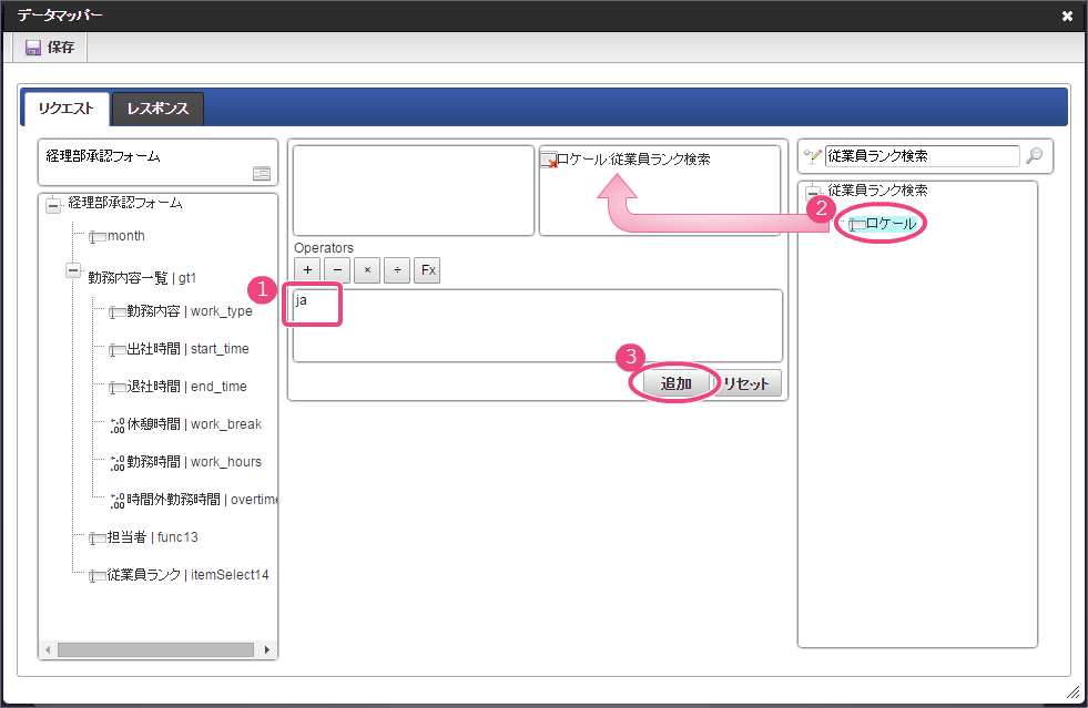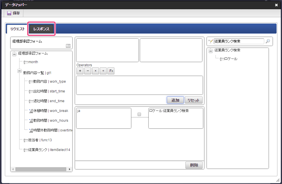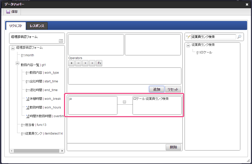 作成済みの「従業員ランク検索」をクリックしてください。 今回は、日本語のデータのみを選択肢として表示できるように設定します。以下の手順で、リクエストを設定してください。 下の図の通りにマッピングが設定できていることを確認してください。 「レスポンス」をクリックしてください。 以下の手順で、従業員ランクのマッピングを設定してください。 以下の手順で、従業員ランク名のマッピングを設定してください。 以下の手順で、時間単価のマッピングを設定してください。 これでデータベースから勤怠種類のマスタを参照して入力するための連携が設定できました。以下の手順で設定を終了してください。 外部連携設定を保存するために「確定」をクリックしてください。 イベント設定を保存するために「確定」をクリックしてください。 ツールキットから「数値」をドラッグ&ドロップで配置してください。 配置した数値をダブルクリックしてプロパティを表示し、以下の通りに設定してください。 引き続き、以下の手順で数値の詳細を設定してください。設定したら、プロパティの外側をクリックして、プロパティを閉じてください。 次にツールキットから「関数」を2つドラッグ&ドロップで配置してください。 中央に配置した関数をダブルクリックしてプロパティを表示し、以下の通りに設定してください。 引き続き、以下の手順で関数の詳細を設定してください。設定したら、プロパティの外側をクリックして、プロパティを閉じてください。 右に配置した関数をダブルクリックしてプロパティを表示し、以下の通りに設定してください。