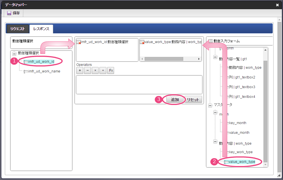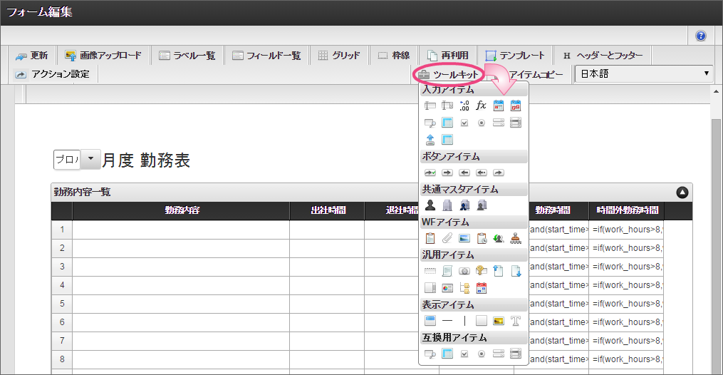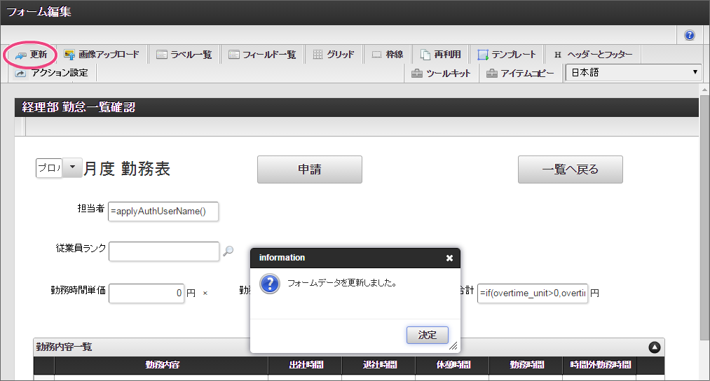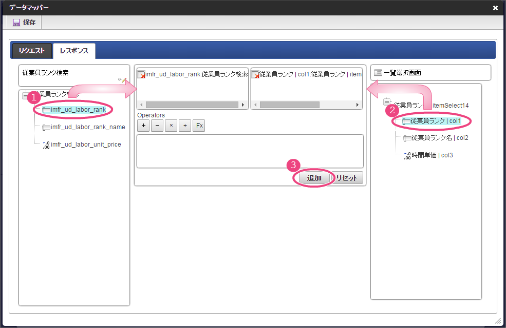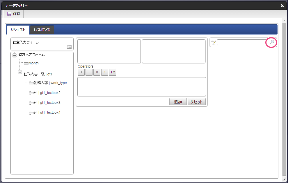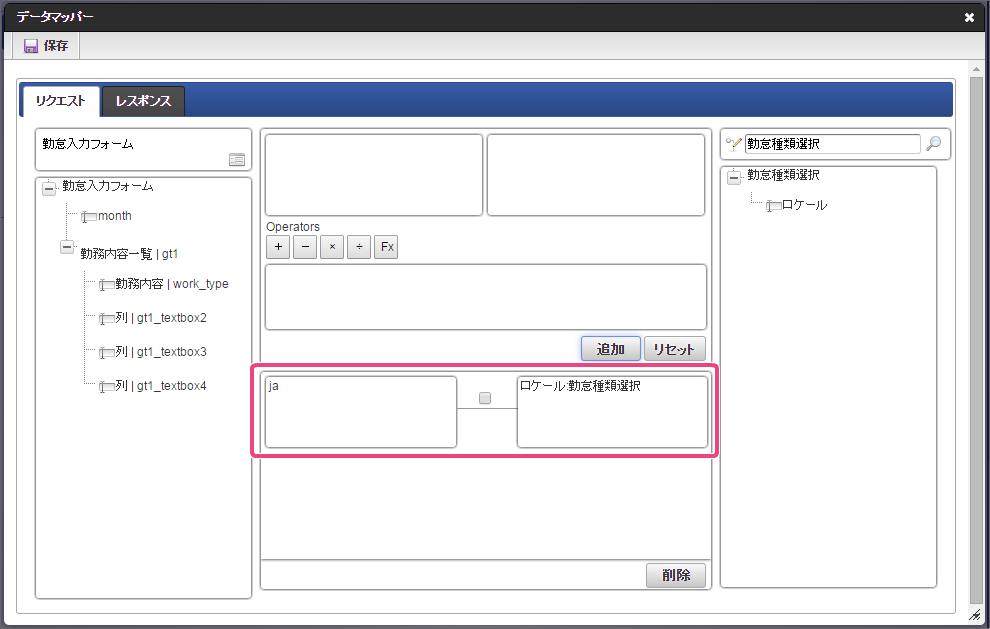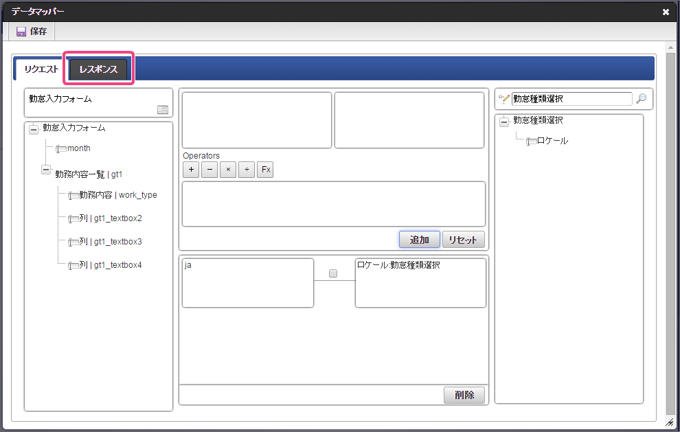 作成済みの「従業員ランク検索」をクリックしてください。 今回は、日本語のデータのみを選択肢として表示できるように設定します。以下の手順で、リクエストを設定してください。 下の図の通りにマッピングが設定できていることを確認してください。 「レスポンス」をクリックしてください。 以下の手順で、従業員ランクのマッピングを設定してください。 以下の手順で、従業員ランク名のマッピングを設定してください。 以下の手順で、時間単価のマッピングを設定してください。 これでデータベースから勤怠種類のマスタを参照して入力するための連携が設定できました。以下の手順で設定を終了してください。 外部連携設定を保存するために「確定」をクリックしてください。 イベント設定を保存するために「確定」をクリックしてください。 ツールキットから「数値」をドラッグ&ドロップで配置してください。 配置した数値をダブルクリックしてプロパティを表示し、以下の通りに設定してください。 引き続き、以下の手順で数値の詳細を設定してください。設定したら、プロパティの外側をクリックして、プロパティを閉じてください。 次にツールキットから「関数」を2つドラッグ&ドロップで配置してください。 中央に配置した関数をダブルクリックしてプロパティを表示し、以下の通りに設定してください。 引き続き、以下の手順で関数の詳細を設定してください。設定したら、プロパティの外側をクリックして、プロパティを閉じてください。 右に配置した関数をダブルクリックしてプロパティを表示し、以下の通りに設定してください。