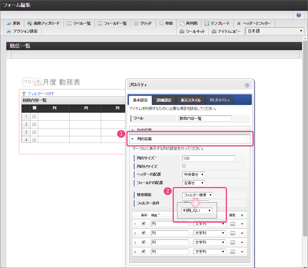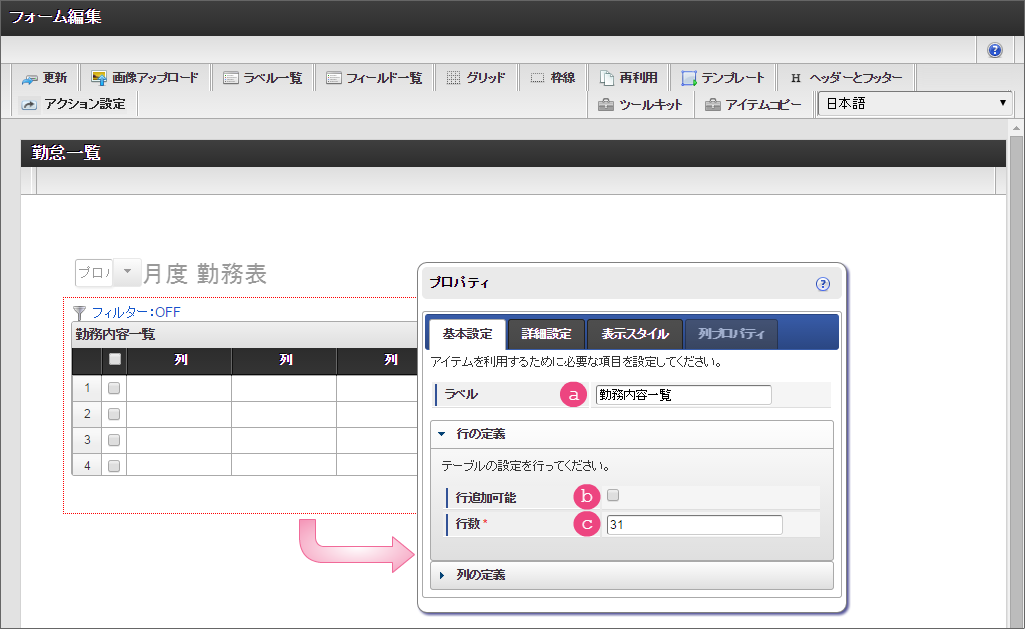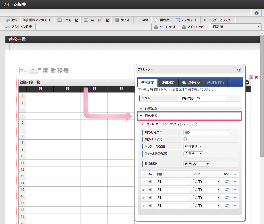 「グリッドテーブル」をダブルクリックしてプロパティを表示してください。プロパティから基本設定の列の定義を展開してください。 以下の手順で、2列目・3列目を設定してください。 「項目の定義」の「」をクリックして、12行にしてください。