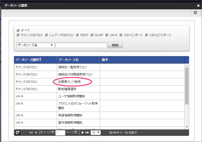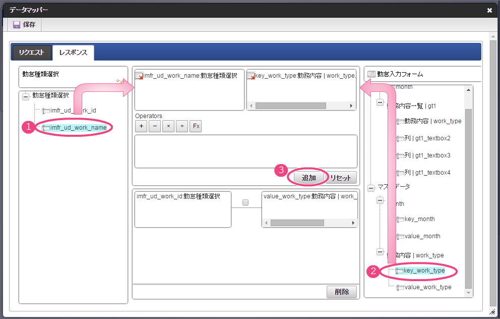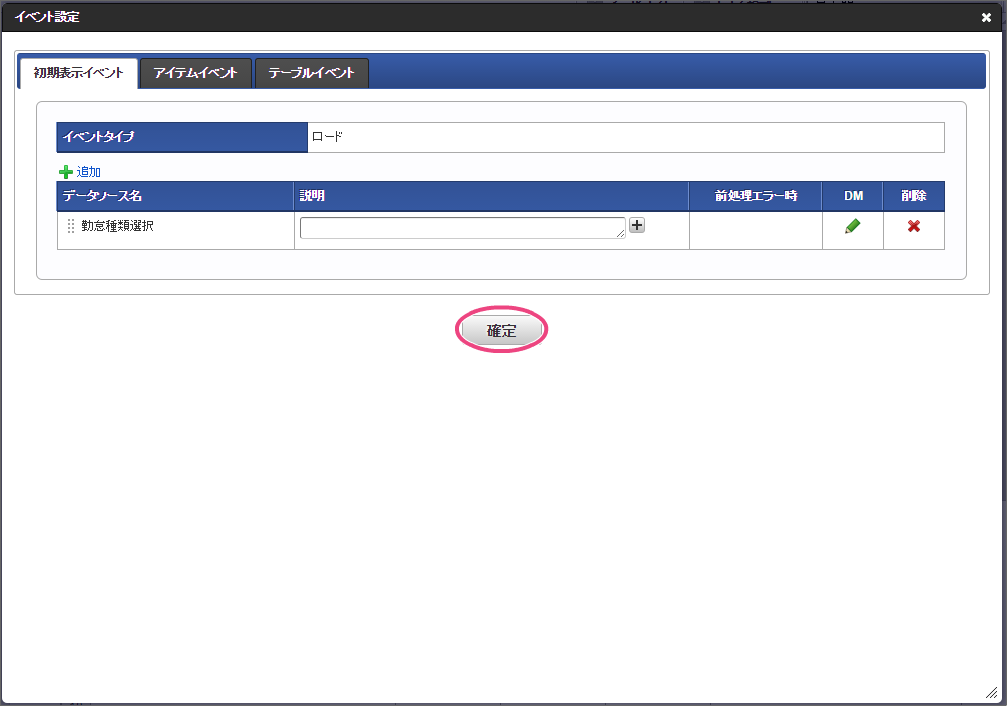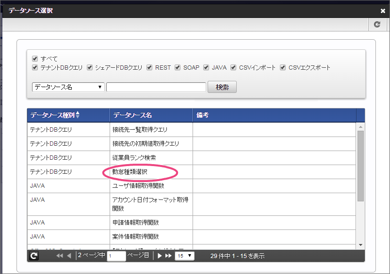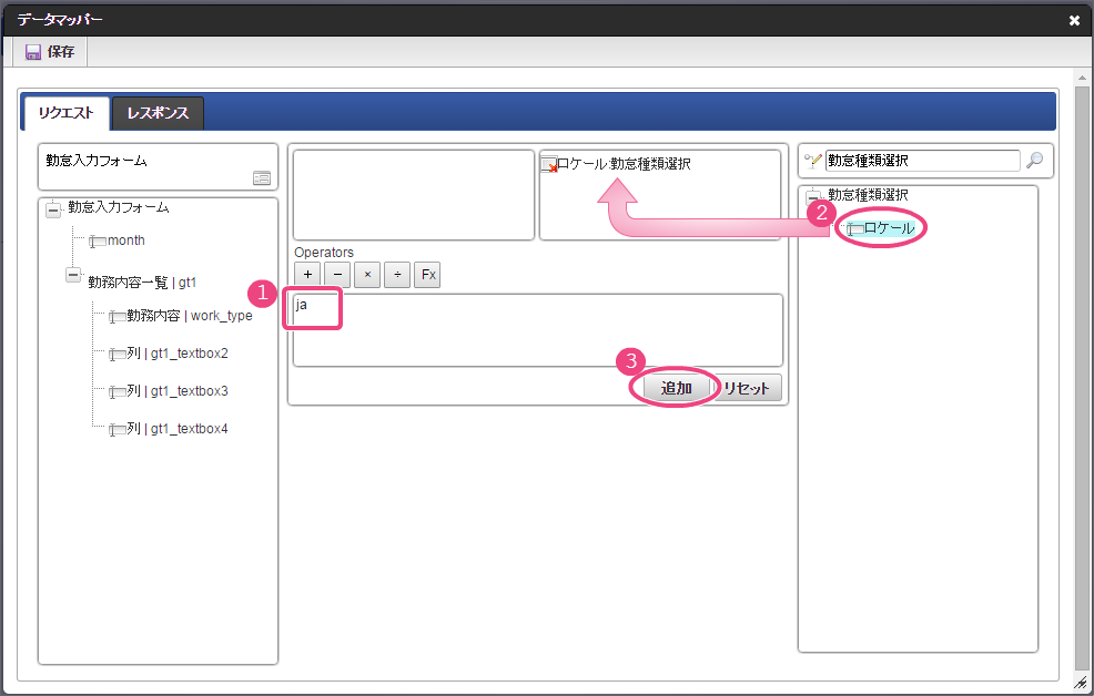 事前準備で登録したテナントDBクエリの「勤怠種類選択」をクリックしてください。 今回は、日本語のデータのみを選択肢として表示できるように設定します。以下の手順で、リクエストを設定してください。 下の図の通りにマッピングが設定できていることを確認してください。 「レスポンス」をクリックしてください。 以下の手順で、勤怠種類コードのマッピングを設定してください。 次に、以下の手順で、勤怠種類名のマッピングを設定してください。 これでデータベースから勤怠種類のマスタを参照して入力するための連携が設定できました。以下の手順で設定を終了してください。 イベント設定を保存するために「確定」をクリックしてください。 ここまでの設定内容を保存するために「更新」をクリックしてください。