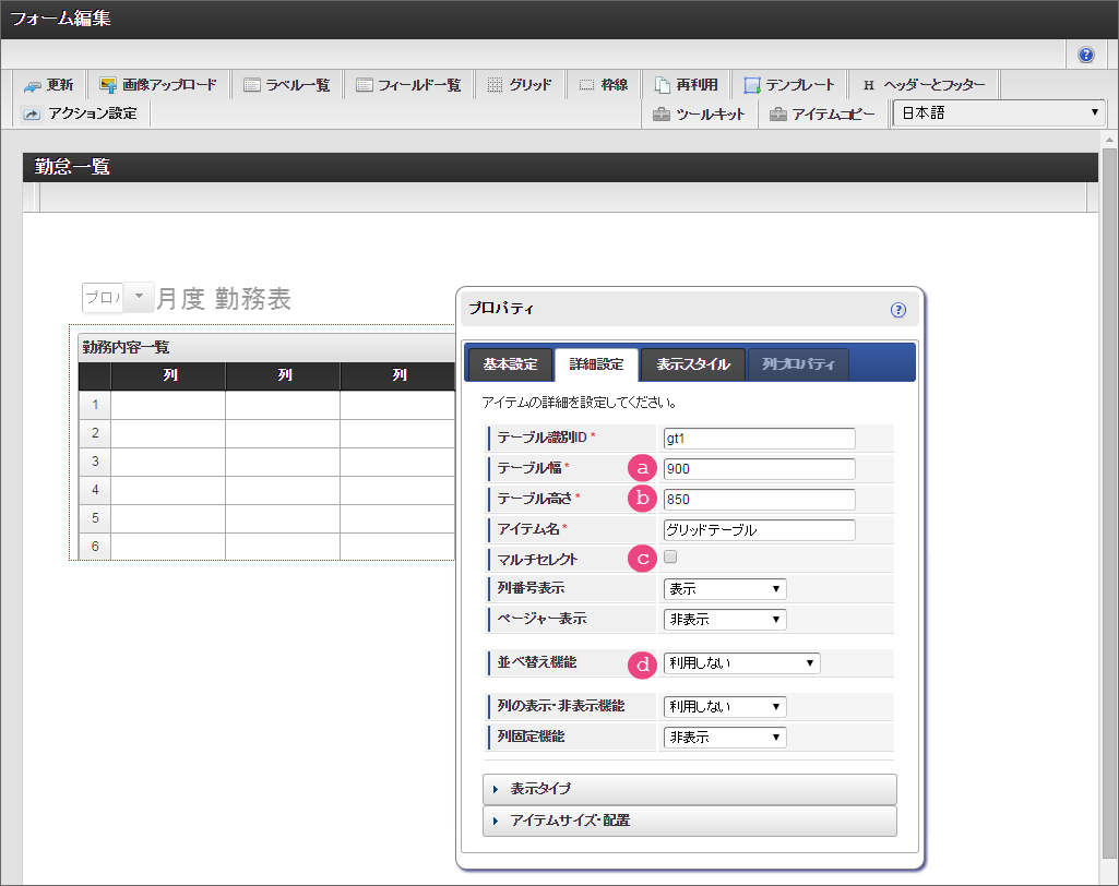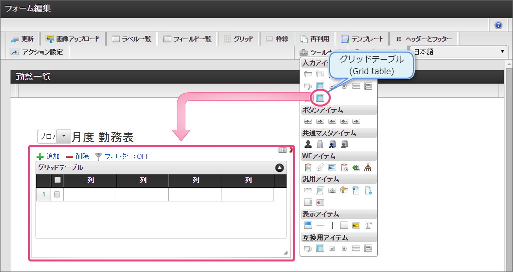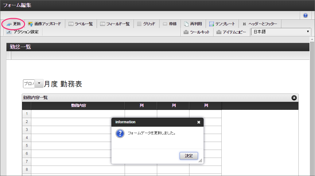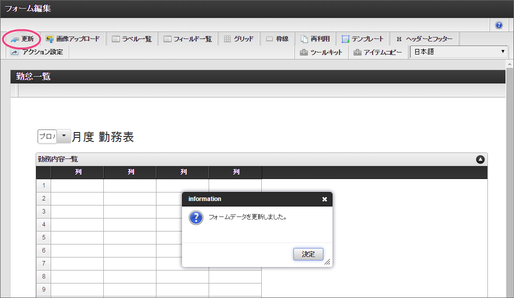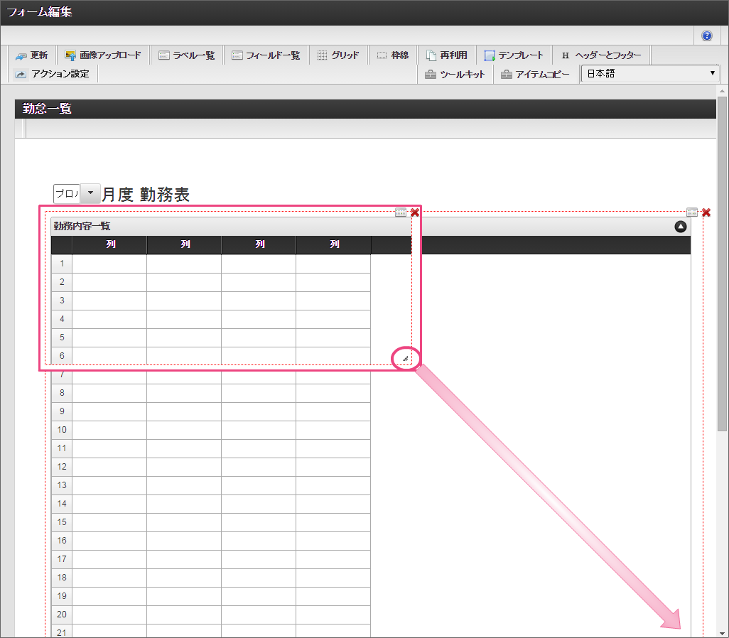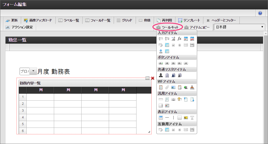 「ツールキット」をクリックして、ツールキットを表示しましょう。 「グリッドテーブル」を配置してください。 「グリッドテーブル」では、以下の通りに設定してください。 以下の手順で、「列の定義」を設定してください。 「詳細設定」をクリックして切り替えた後、以下の通りに「詳細設定」を設定してください。 「ツールキット」をクリックし、ツールキットの表示を消してください。 グリッドテーブルを一度クリック後、グリッドテーブルを囲う赤枠の右下をドラッグして全体が表示できるように調整してください。 ここまでの設定内容を保存するために「更新」をクリックしてください。