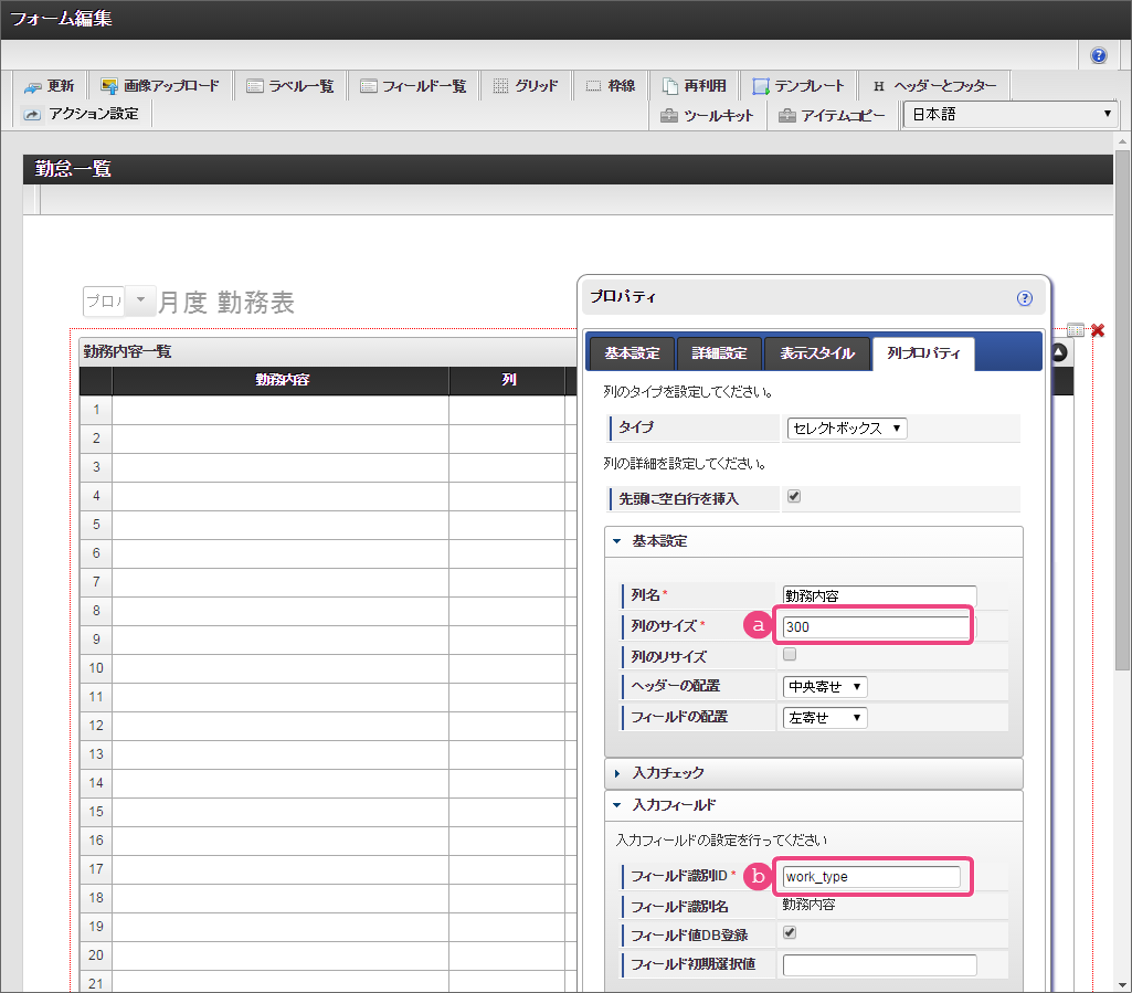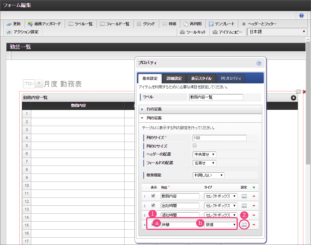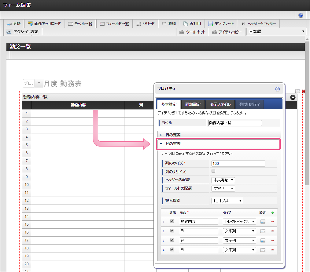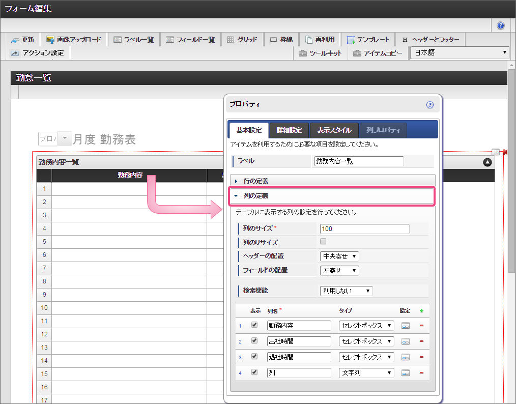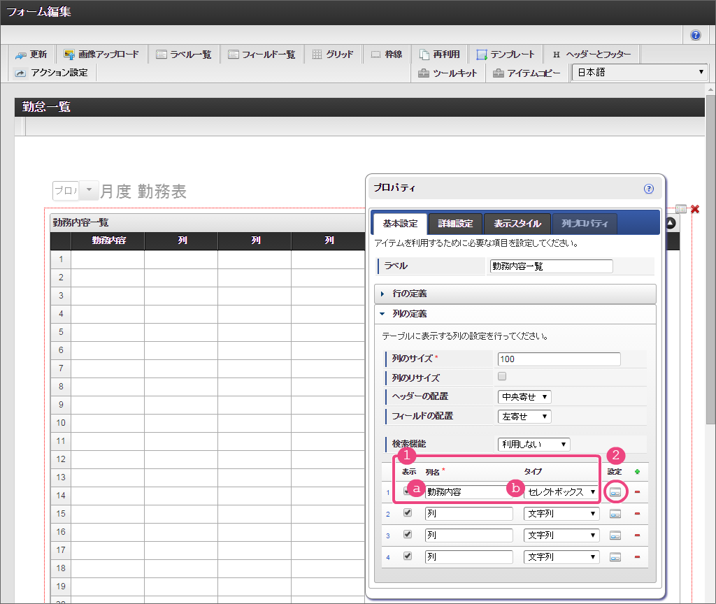 勤務内容の列の表示方法などを設定していきましょう。