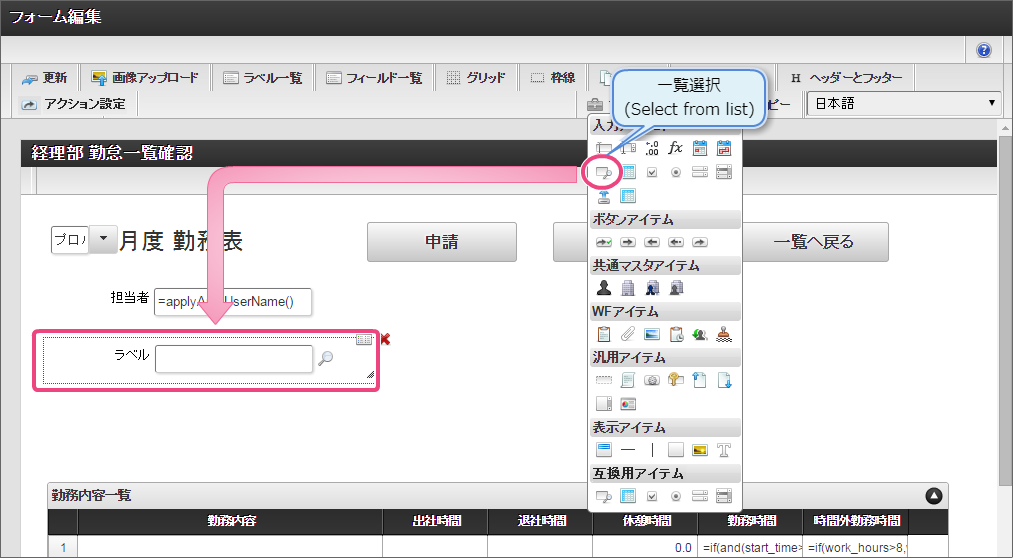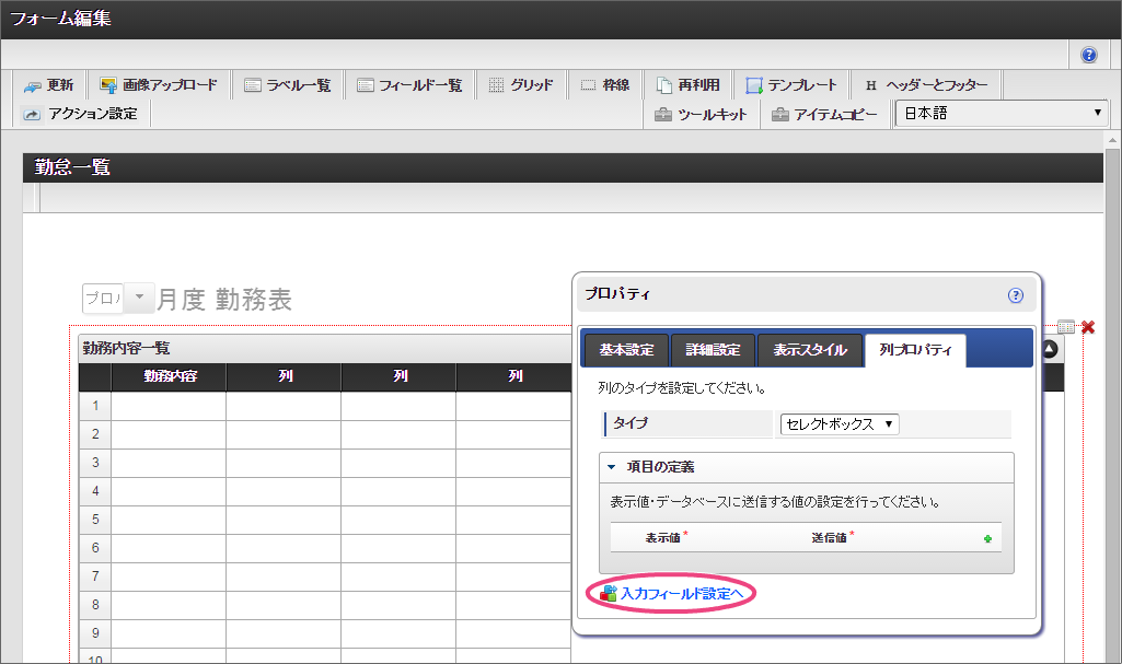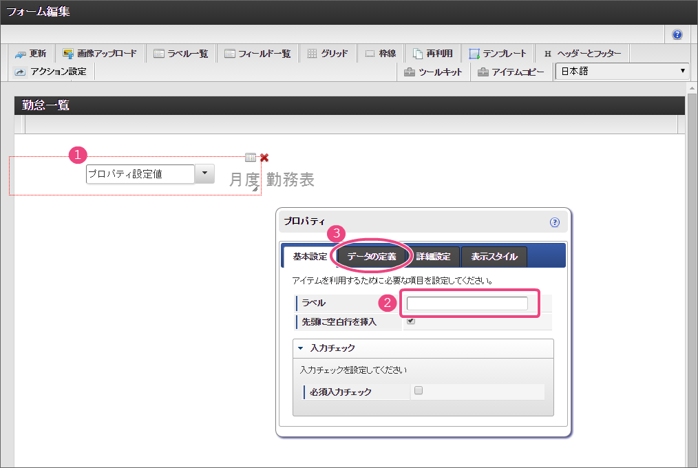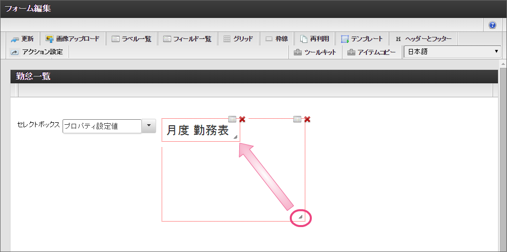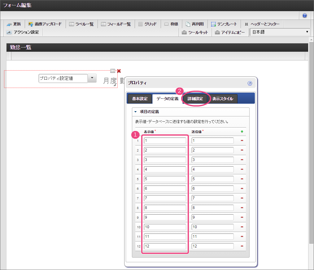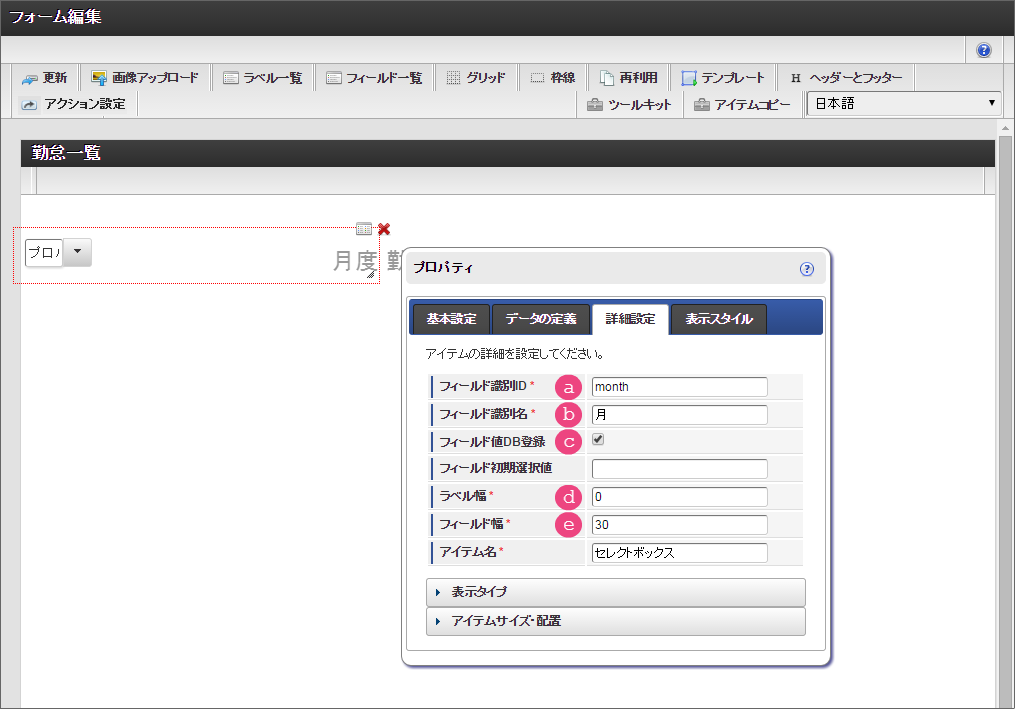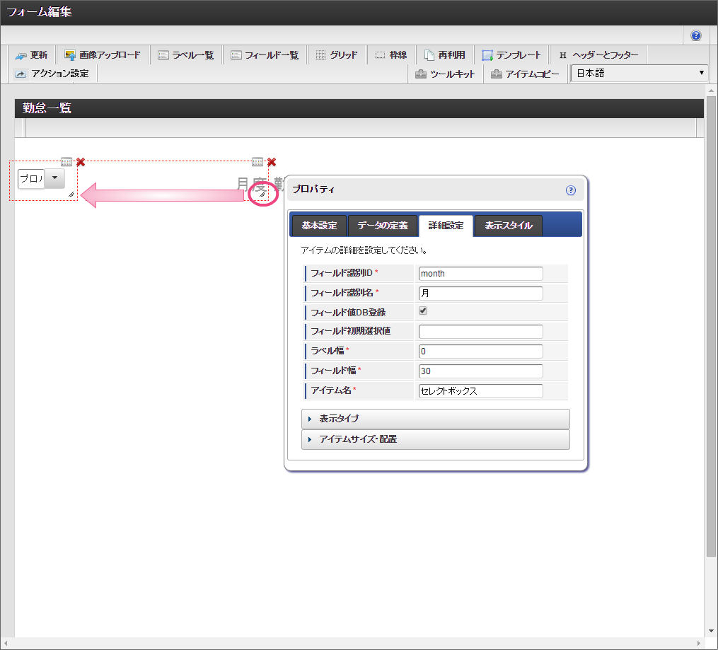 セレクトボックスは、入力対象の月を指定する項目として利用します。以下の手順で、「データの定義」を設定してください。 「詳細設定」では、以下の通りに設定してください。 ラベルアイテムと同様に、赤枠の右下をドラッグしてアイテムの範囲を調整してください。 レイアウトを整えるために、セレクトボックスとラベルアイテムをドラッグして位置を調整してください。 ここまでの設定内容を保存するために「更新」をクリックしてください。