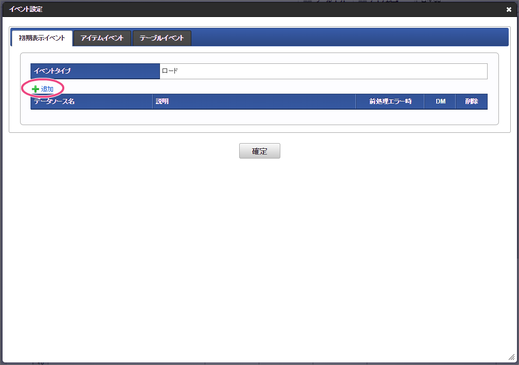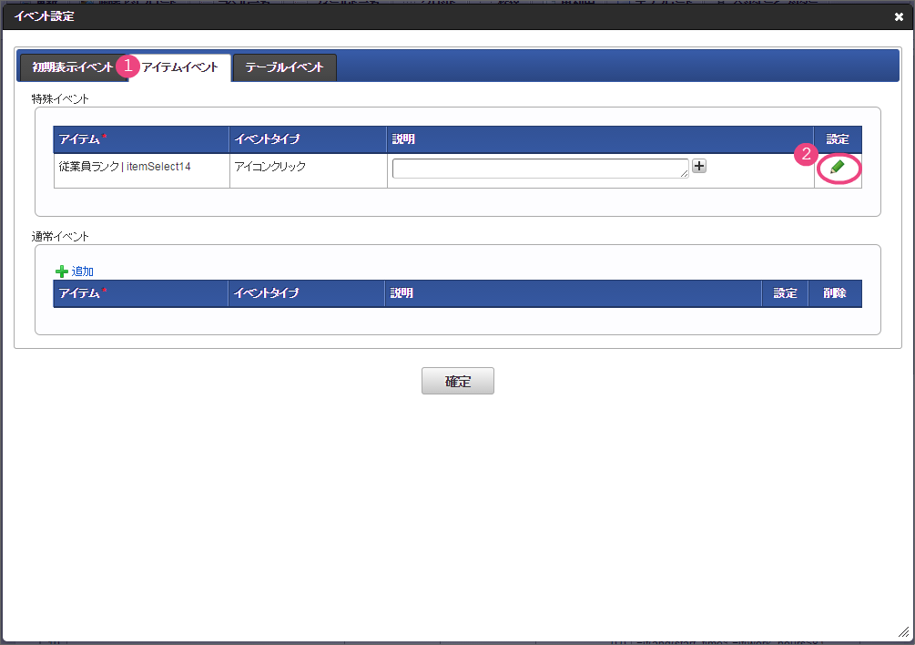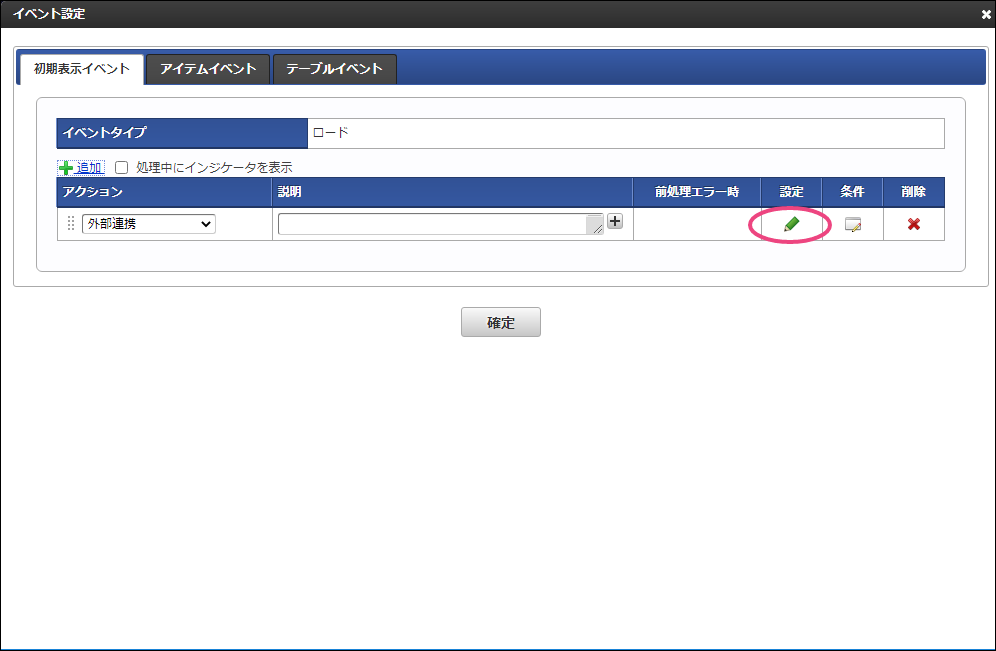 「グリッドテーブル」をダブルクリックしてプロパティを表示しましょう。基本設定の列の定義を展開してください。 以下の手順で、1列目を設定してください。 「入力フィールド設定へ」をクリックしてください。 以下の通りに「列プロパティ」の「入力フィールド設定」を設定してください。 「アクション設定」をクリックしてください。 「初期表示イベント」の「追加」をクリックしてください。 追加された行のをクリックしてください。