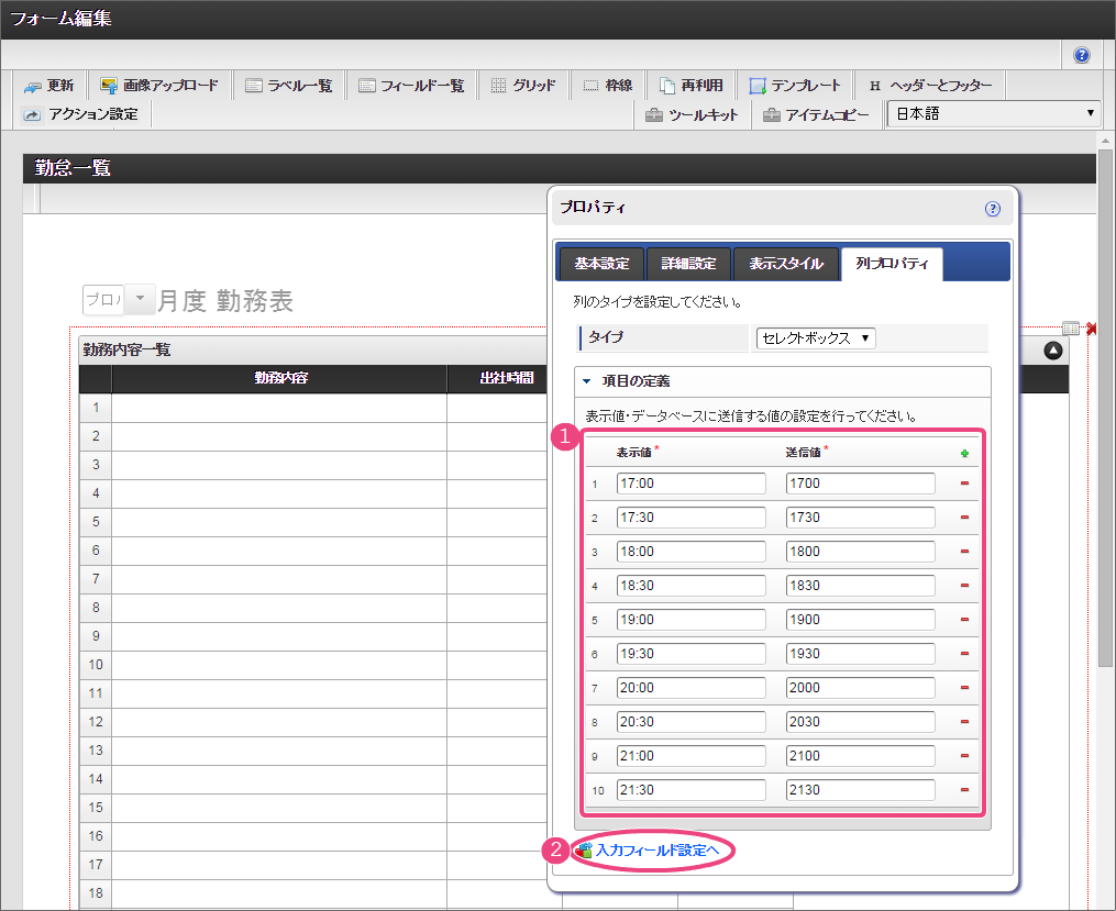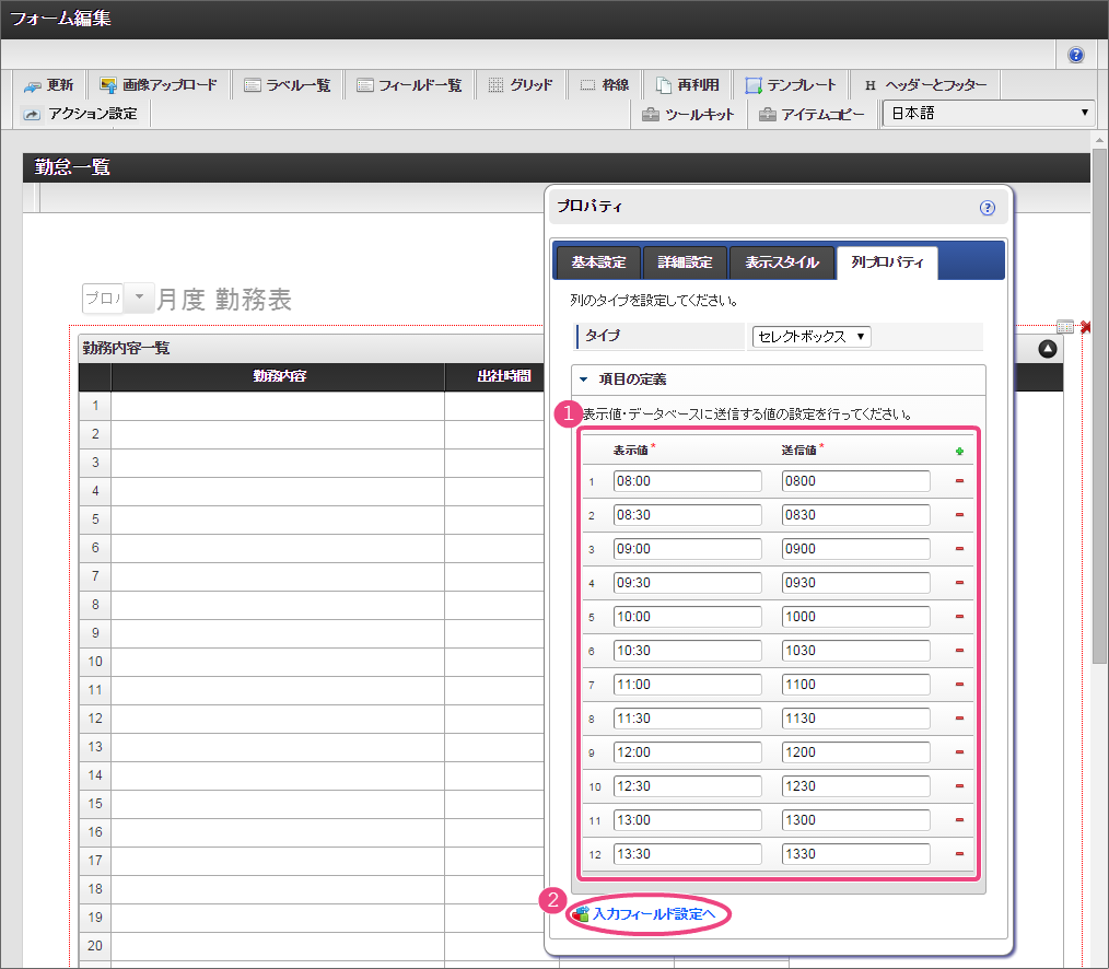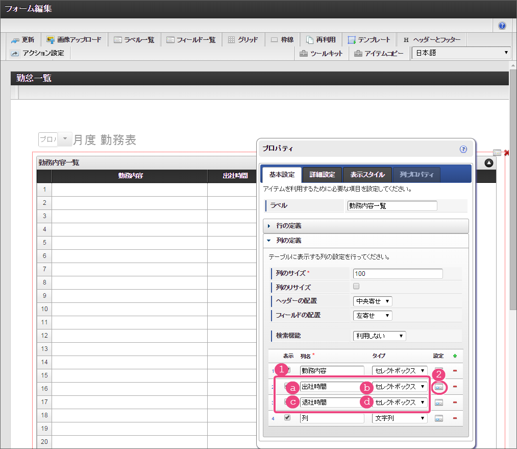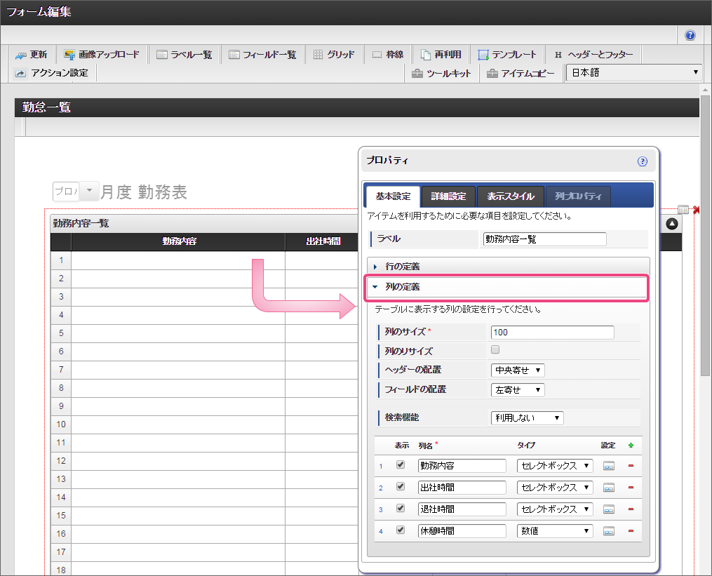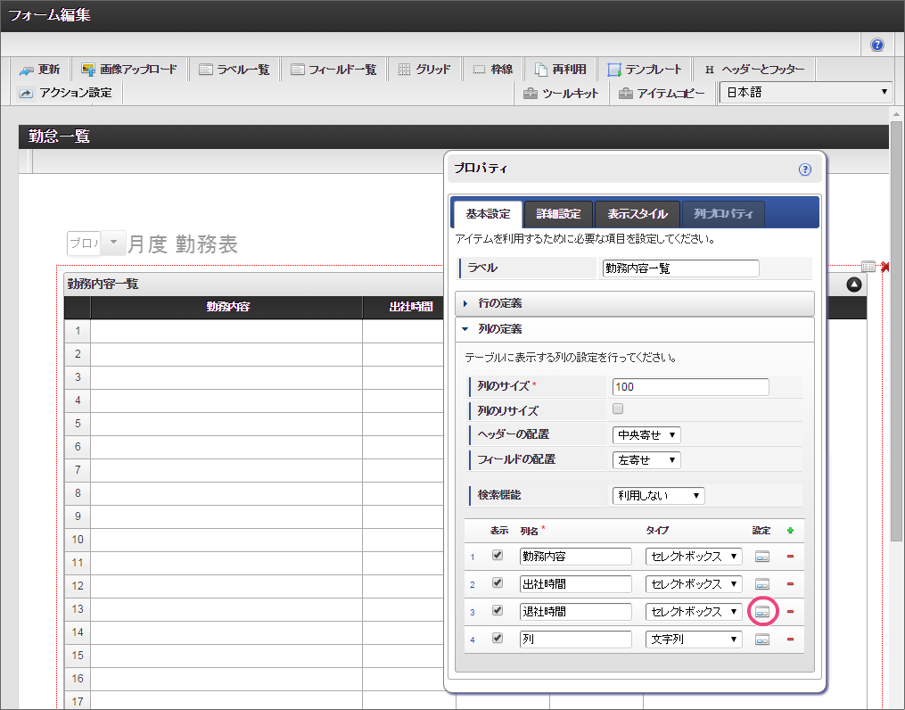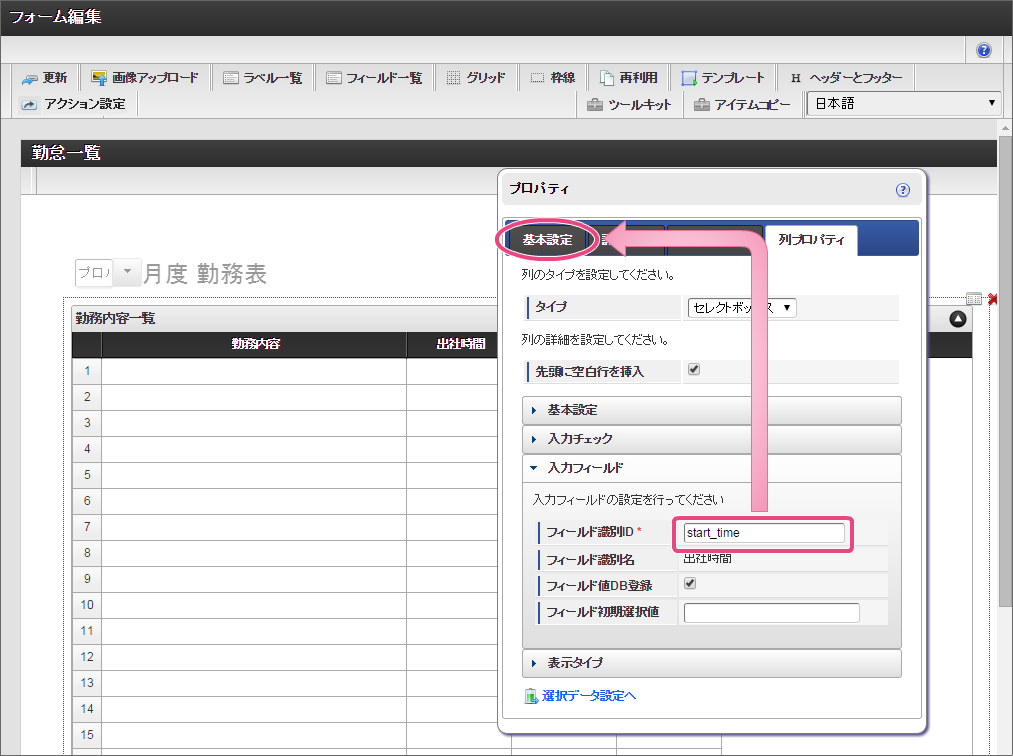 以下の手順で、「項目の定義」を設定してください。 フィールド識別IDを「start_time」に変更し、「基本設定」をクリックしてください。 3列目の「退社時間」の「列プロパティ」を設定するために「」アイコンをクリックしてください。