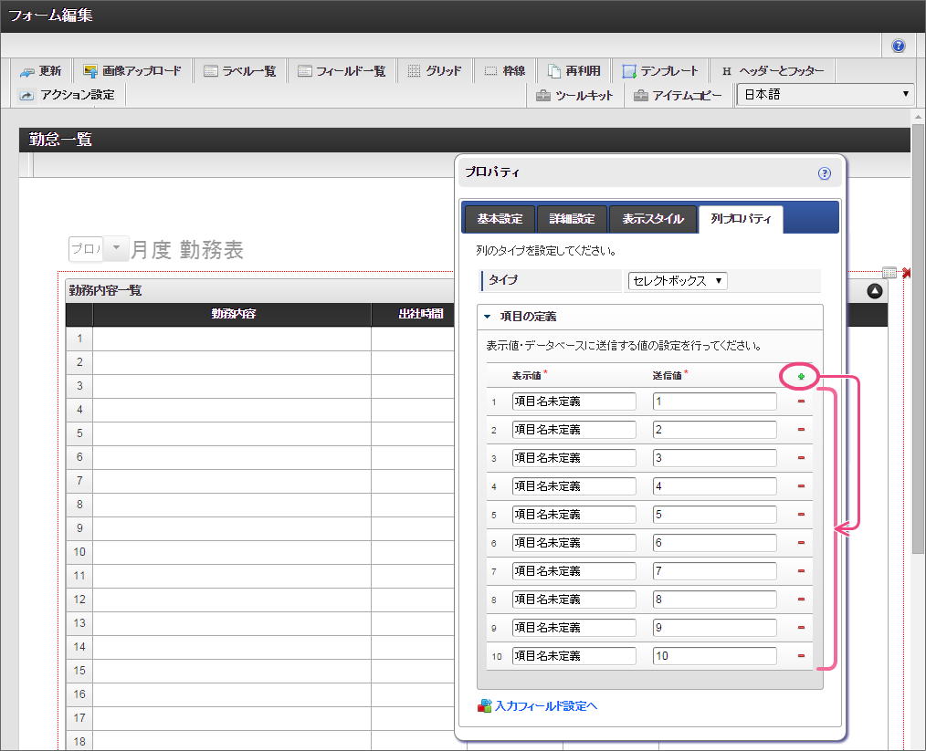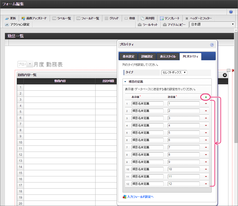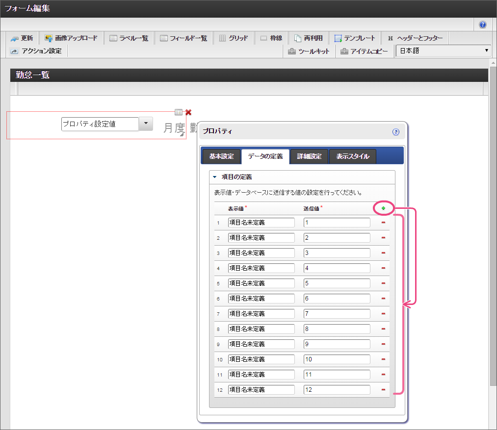 を12回クリックして、表示値・送信値の行を12行にしてください。