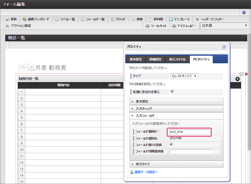 以下の手順で、「項目の定義」を設定してください。 フィールド識別IDを「end_time」に変更し、プロパティを閉じてください。 ここまでの設定内容を保存するために「更新」をクリックしてください。