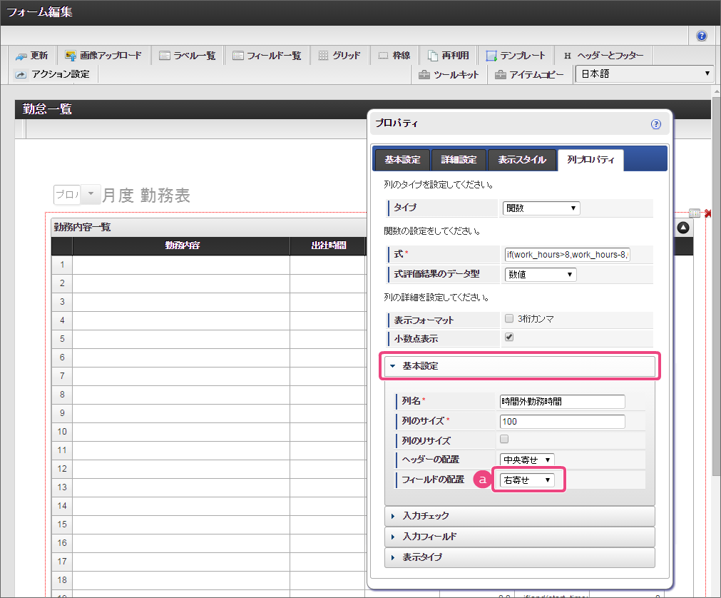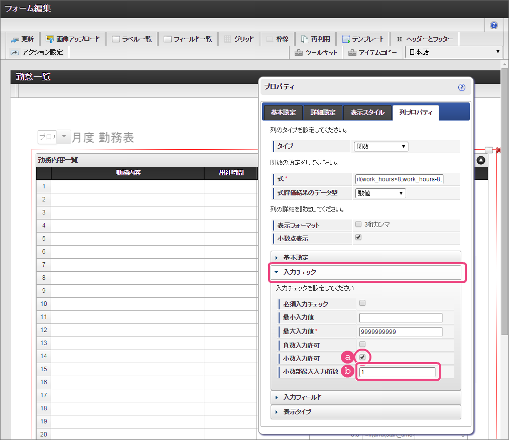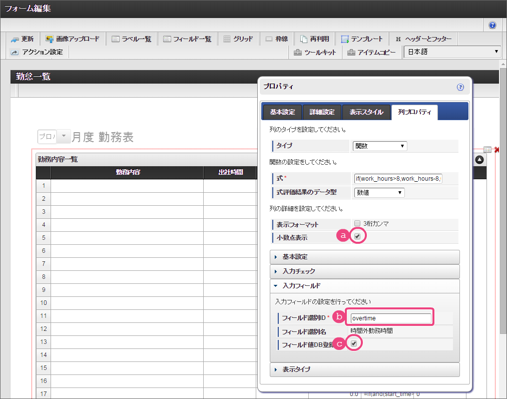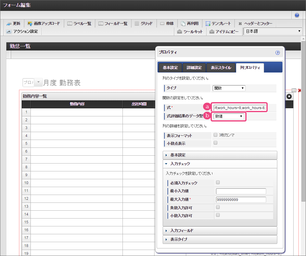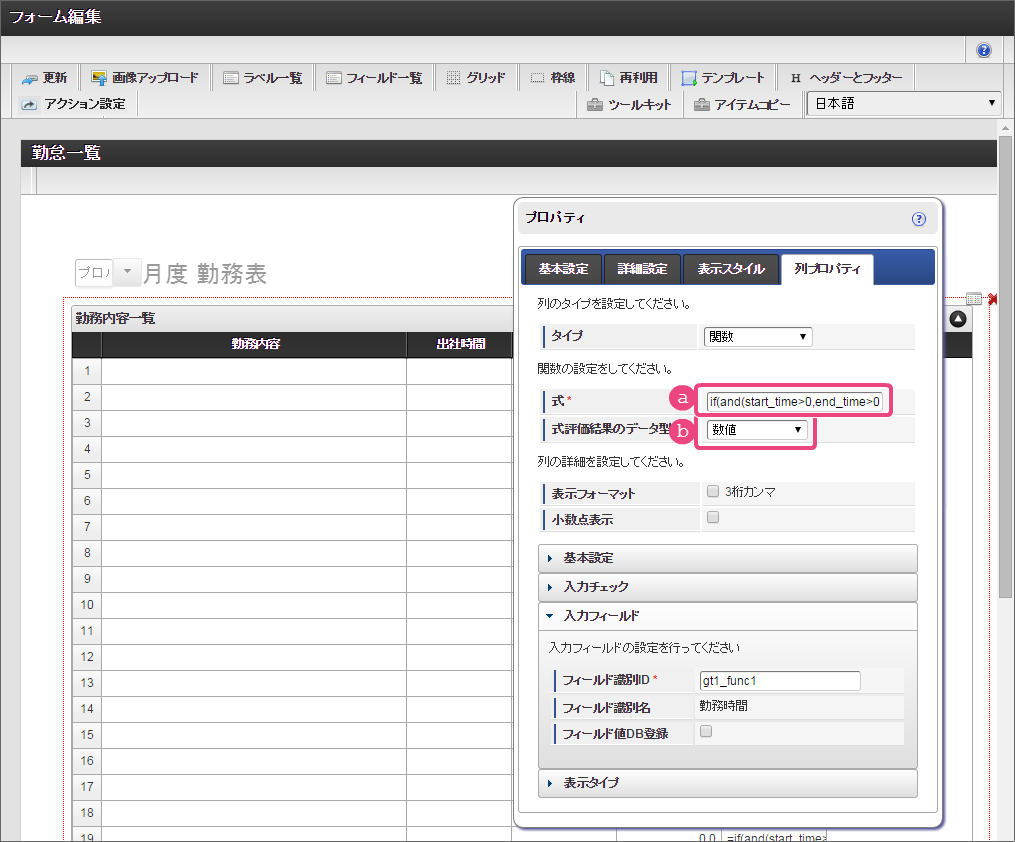 設定項目 設定値 a 式 if(and(start_time>0,end_time>0),rounddown((end_time-start_time)/100,0)+(if((end_time-start_time)-rounddown((end_time-start_time)/100,0)*100>40,(((end_time-start_time)-rounddown((end_time-start_time)/100,0)*100)-40),(end_time-start_time)-rounddown((end_time-start_time)/100,0)*100))/60-work_break,0) b 式評価結果のデータ型 数値 コラム