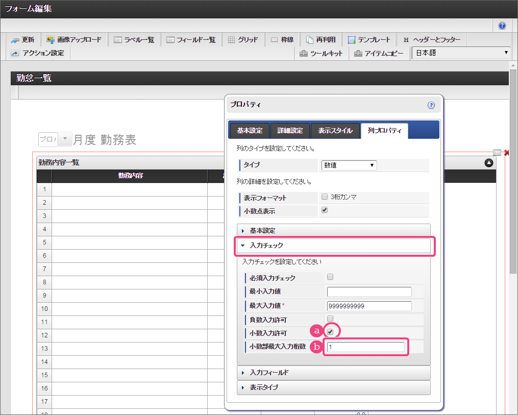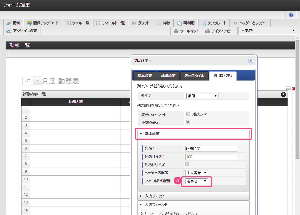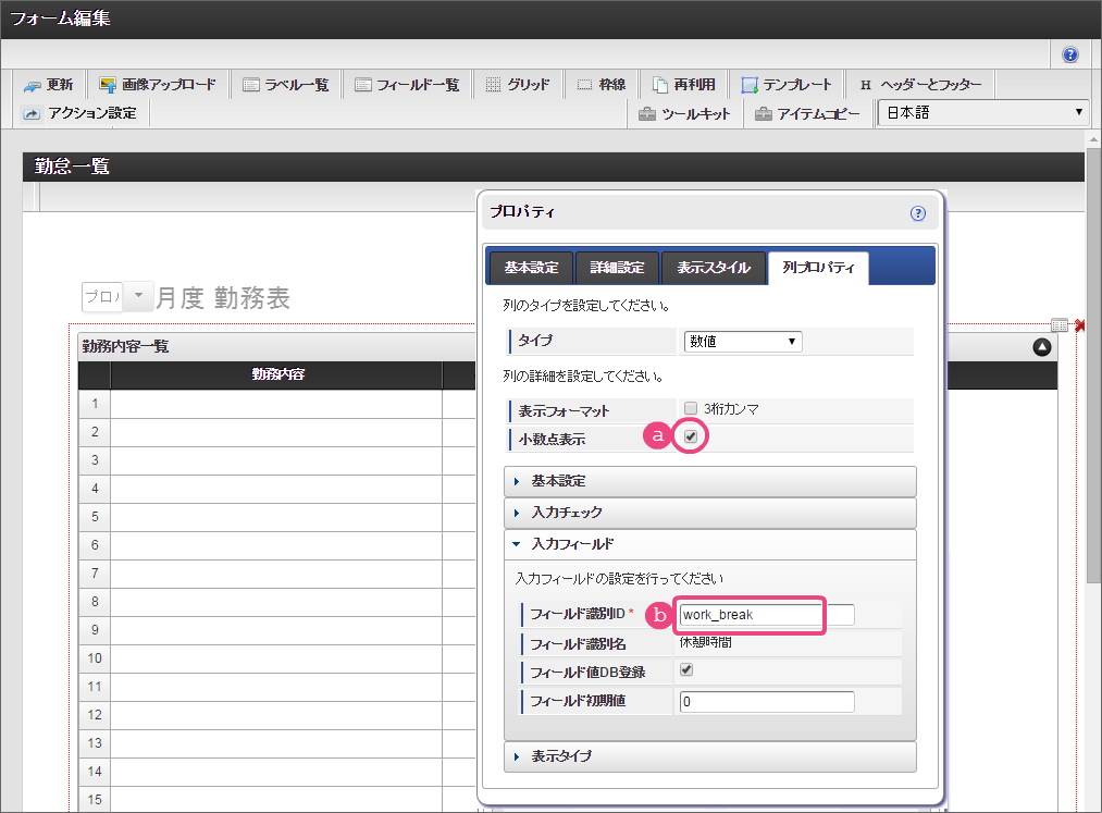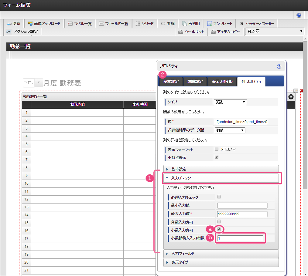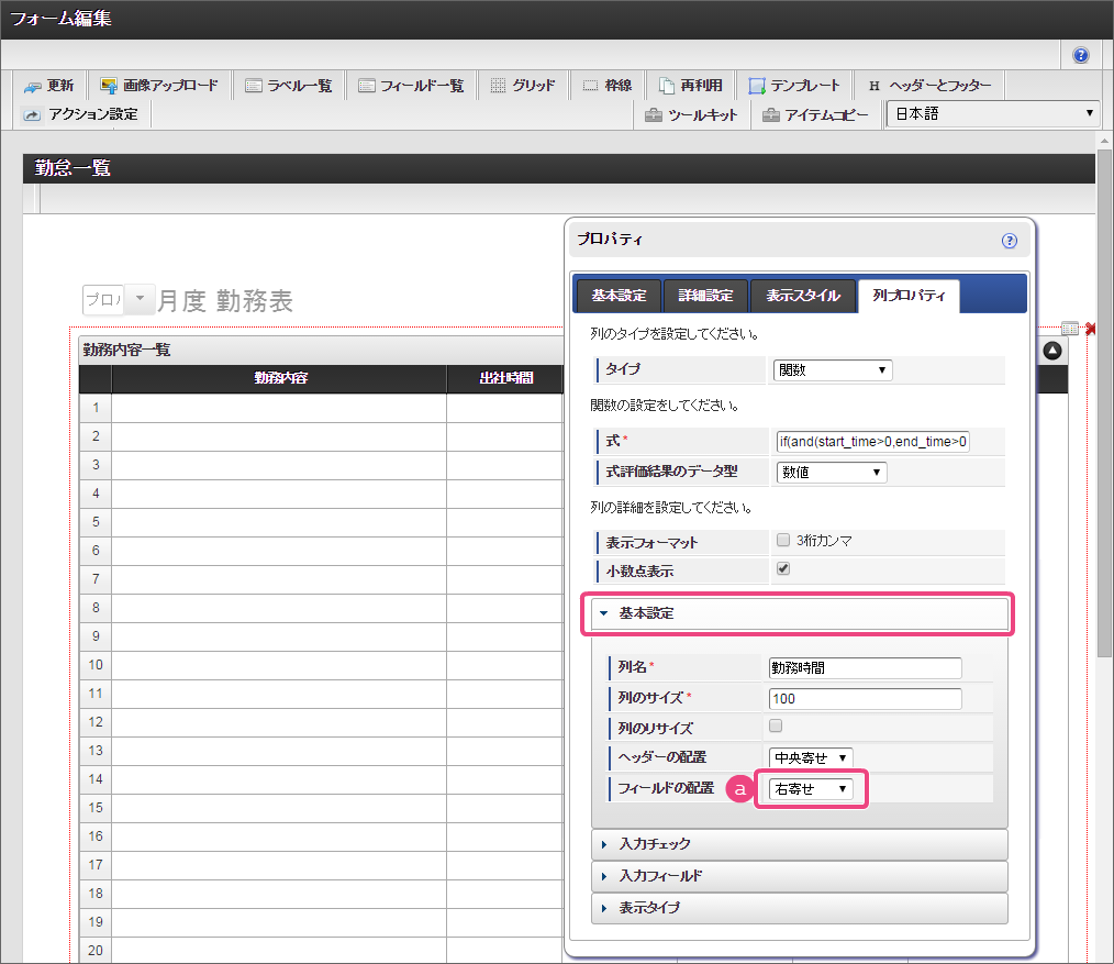 設定項目 設定値 a 式 if(and(start_time>0,end_time>0),rounddown((end_time-start_time)/100,0)+(if((end_time-start_time)-rounddown((end_time-start_time)/100,0)*100>40,(((end_time-start_time)-rounddown((end_time-start_time)/100,0)*100)-40),(end_time-start_time)-rounddown((end_time-start_time)/100,0)*100))/60-work_break,0) b 式評価結果のデータ型 数値 コラム