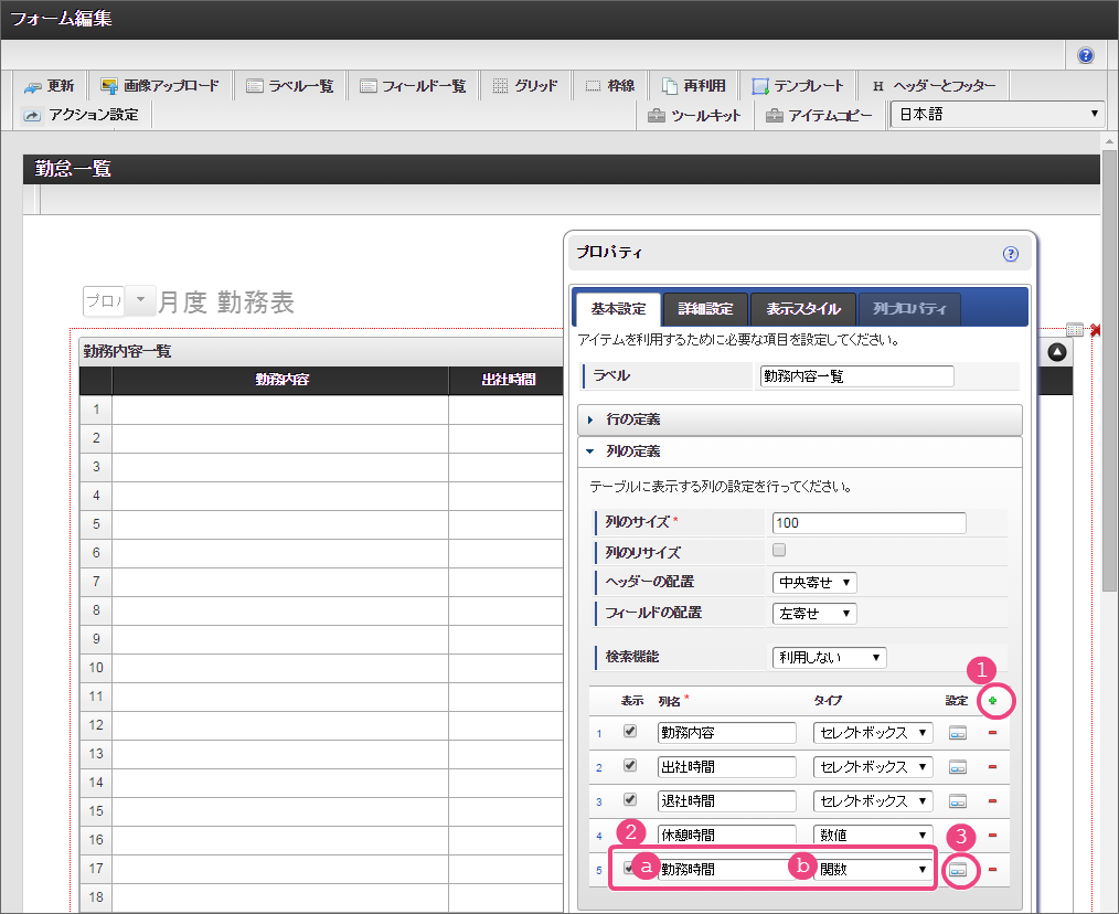 「グリッドテーブル」をダブルクリックしてプロパティを表示してください。プロパティから基本設定の列の定義を展開してください。 以下の手順で5列目を追加し、設定してください。 「列プロパティ」の式に対し、以下の通りに設定してください。
