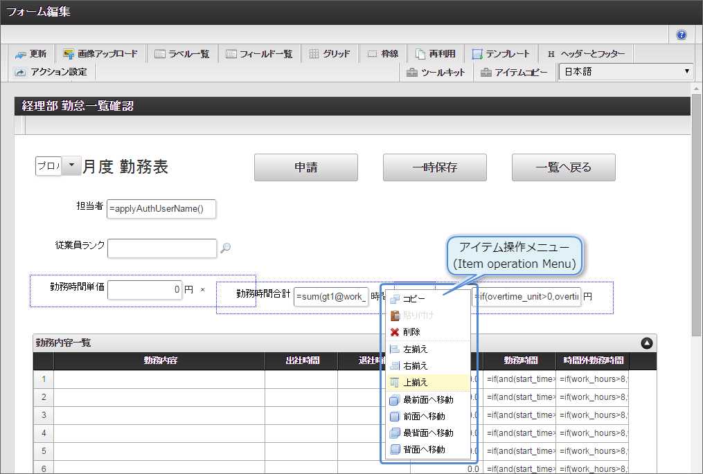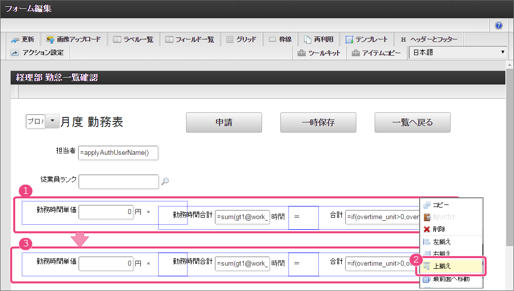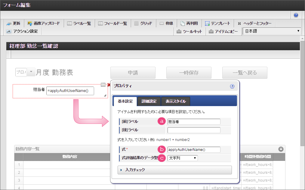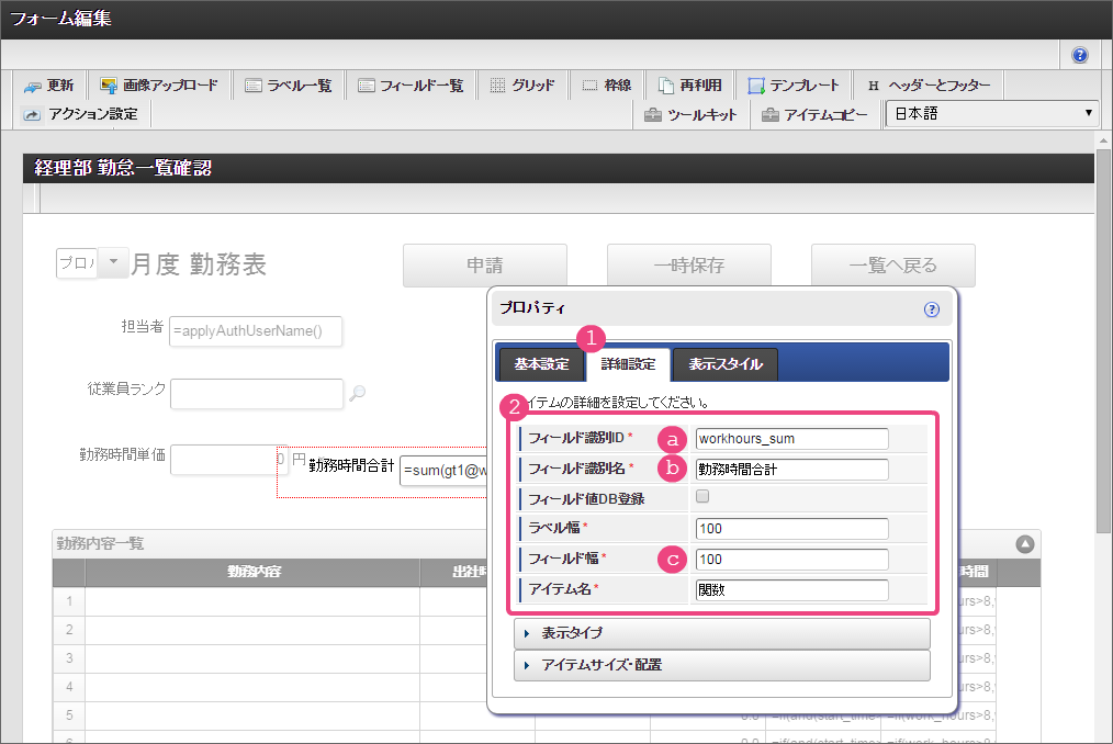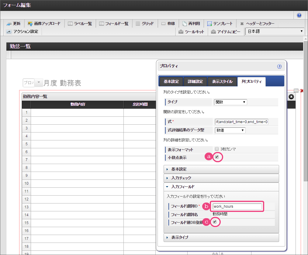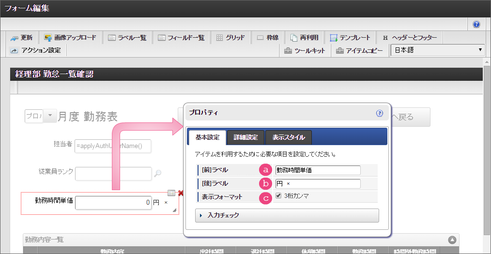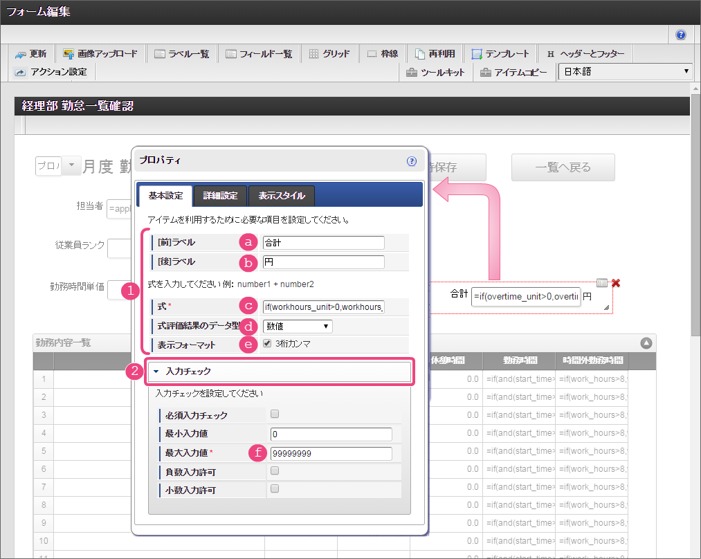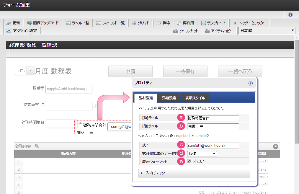 設定項目 設定値 a [前]ラベル 合計 b [後]ラベル 円 c 式 if(workhours_unit>0,workhours_unit*workhours_sum,0) d 式評価結果のデータ型 数値 e 表示フォーマット 3桁カンマご利用のバージョンにより設定方法が異なります。