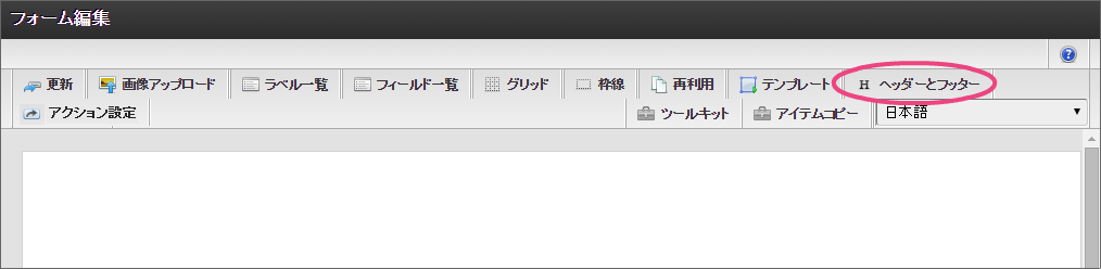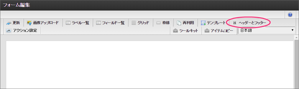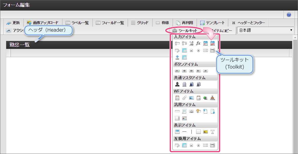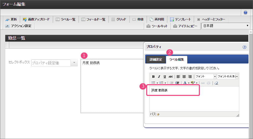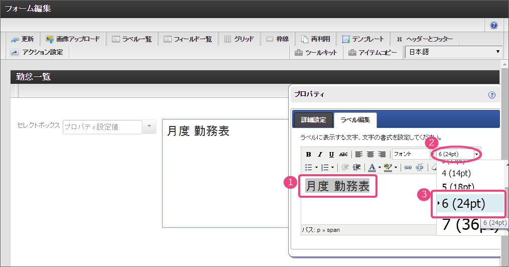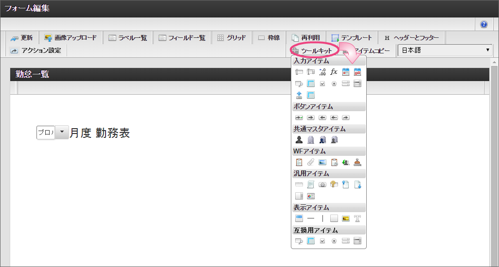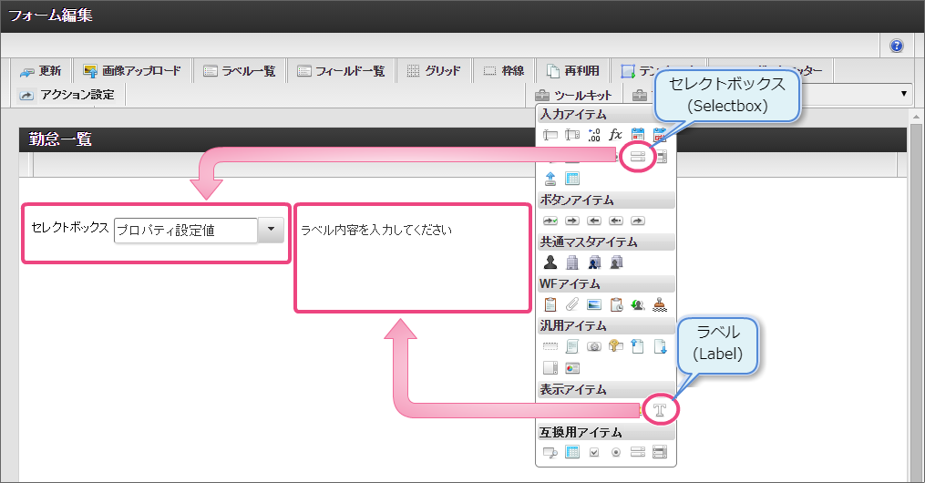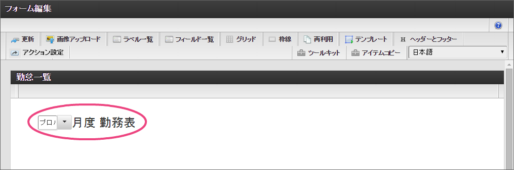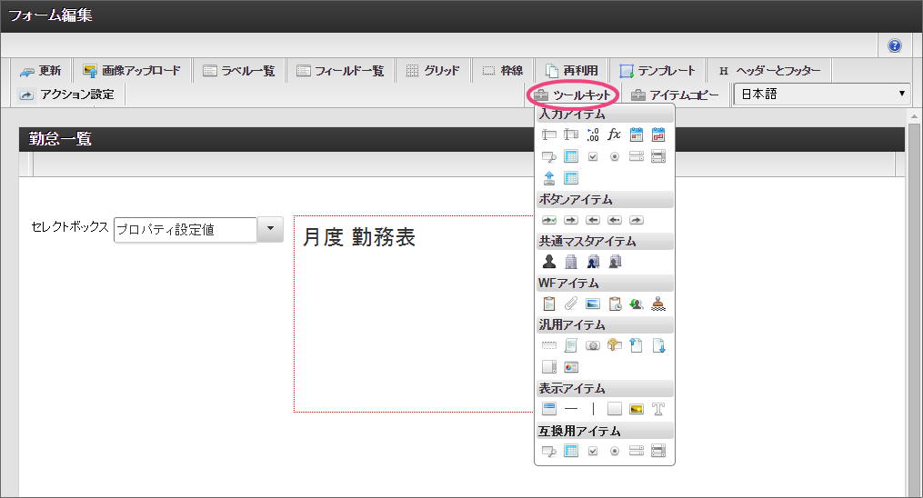 一番左の「担当者入力」アイコンをダブルクリックして、入力項目の編集画面を表示しましょう。 「フォーム-登録」画面では、以下の通りに入力し、「登録」をクリックしてください。 新しくポップアップで表示された画面の右上の「ヘッダーとフッター」をクリックしましょう。 「ヘッダー設定」では、以下の通りに入力し、「設定」をクリックしてください。 「ツールキット」をクリックして、ツールキットを表示しましょう。 アイテムの「セレクトボックス」と「ラベル」をドラッグ&ドロップで配置してください。 以下の手順で「ラベル」アイテムを編集してください。 引き続き、以下の手順で「ラベル」アイテムに入力した文字を装飾してください。 「ツールキット」をクリックし、ツールキットの表示を消してください。 ラベルの赤枠の右下をドラッグしてアイテム範囲を表示に合わせて小さくしてください。 以下の手順で「セレクトボックス」を設定してください。を12回クリックして、表示値・送信値の行を12行にしてください。