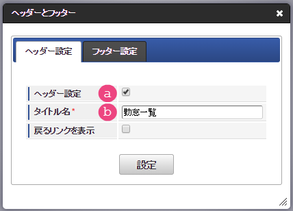 新しくポップアップで表示された画面の右上の「ヘッダーとフッター」をクリックしましょう。「ヘッダー設定」では、以下の通りに入力し、「設定」をクリックしてください。