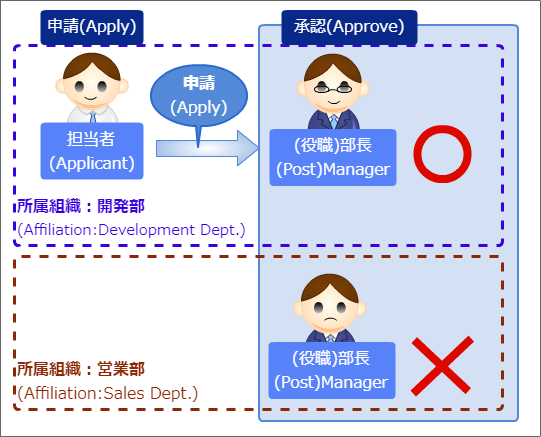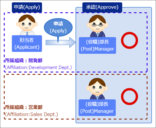 開発部の部長・竹中さんと営業部の部長・黒田(長)さんの両方が承認できる申請者の所属組織+役職の場合
